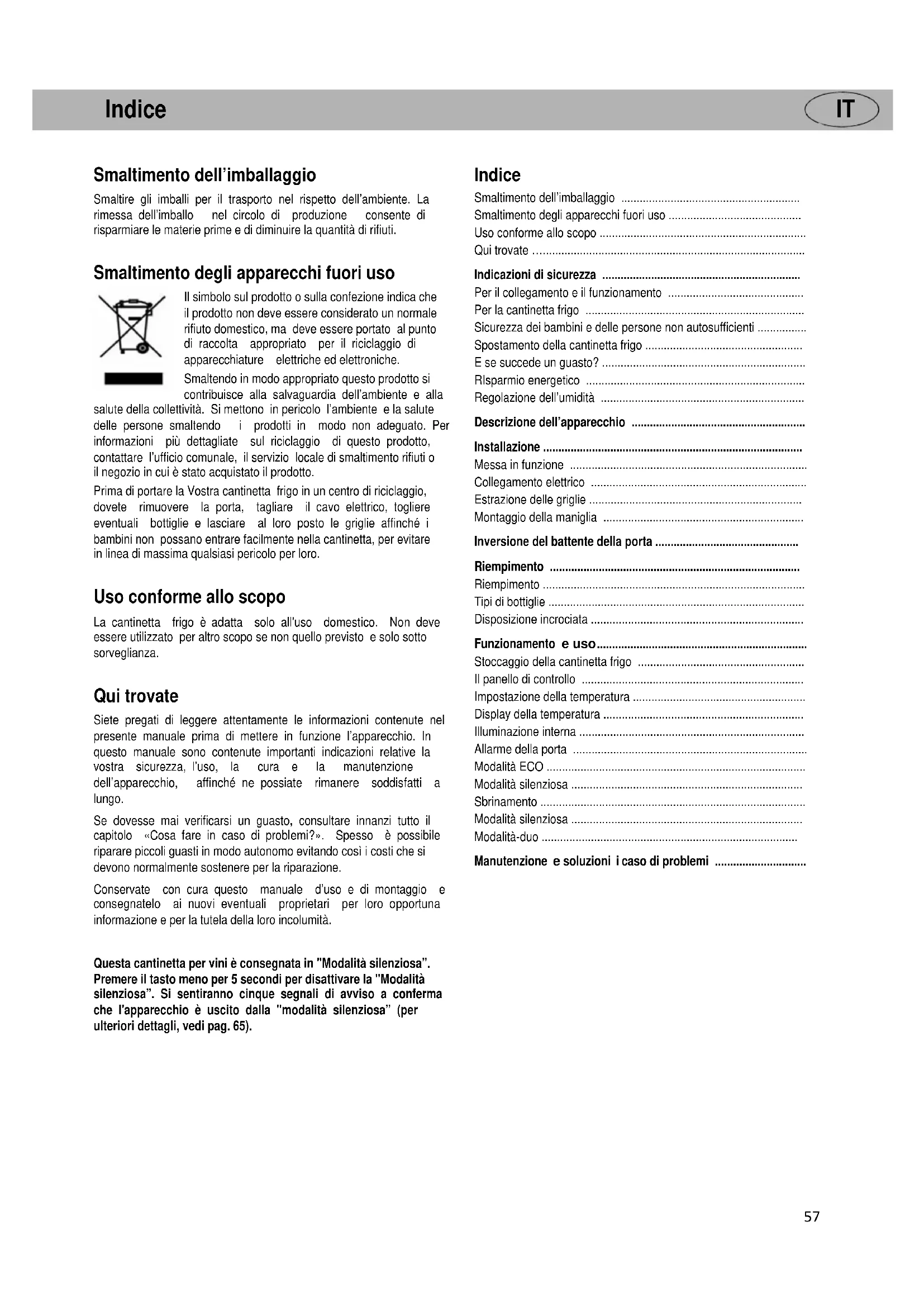Smaltimento dell’imballaggio Smaltire gli imballi per il trasporto nel rispetto dell’ambiente. La rimessa dell’imballo nel circolo di produzione consente di risparmiare le materie prime e di diminuire la quantità di rifiuti. Smaltimento degli apparecchi fuori uso Il simbolo sul prodotto o sulla confezione indica che il prodotto non deve essere considerato un normale rifiuto domestico, ma deve essere portato al punto di raccolta appropriato per il riciclaggio di apparecchiature elettriche ed elettroniche. Smaltendo in modo appropriato questo prodotto si contribuisce alla salvaguardia dell’ambiente e alla salute della collettività. Si mettono in pericolo l’ambiente e la salute delle persone smaltendo i prodotti in modo non adeguato. Per informazioni più dettagliate sul riciclaggio di questo prodotto, contattare l’ufficio comunale, il servizio locale di smaltimento rifiuti o il negozio in cui è stato acquistato il prodotto. Prima di portare la Vostra cantinetta frigo in un centro di riciclaggio, dovete rimuovere la porta, tagliare il cavo elettrico, togliere eventuali bottiglie e lasciare al loro posto le griglie affinché i bambini non possano entrare facilmente nella cantinetta, per evitare in linea di massima qualsiasi pericolo per loro. Uso conforme allo scopo La cantinetta frigo è adatta solo all'uso domestico. Non deve essere utilizzato per altro scopo se non quello previsto e solo sotto sorveglianza. Qui trovate Siete pregati di leggere attentamente le informazioni contenute nel presente manuale prima di mettere in funzione l’apparecchio. In questo manuale sono contenute importanti indicazioni relative la vostra sicurezza, l’uso, la cura e la manutenzione dell’apparecchio, affinché ne possiate rimanere soddisfatti a lungo. Se dovesse mai verificarsi un guasto, consultare innanzi tutto il capitolo «Cosa fare in caso di problemi?». Spesso è possibile riparare piccoli guasti in modo autonomo evitando così i costi che si devono normalmente sostenere per la riparazione. Conservate con cura questo manuale d’uso e di montaggio e consegnatelo ai nuovi eventuali proprietari per loro opportuna informazione e per la tutela della loro incolumità. Questa cantinetta per vini è consegnata in "Modalità silenziosa”. Premere il tasto meno per 5 secondi per disattivare la "Modalità silenziosa”. Si sentiranno cinque segnali di avviso a conferma che l'apparecchio è uscito dalla "modalità silenziosa” (per ulteriori dettagli, vedi pag. 65). Indice Smaltimento dell’imballaggio .......................................................... Smaltimento degli apparecchi fuori uso ........................................... Uso conforme allo scopo ................................................................... Qui trovate …..................................................................................... Indicazioni di sicurezza ................................................................. Per il collegamento e il funzionamento ............................................ Per la cantinetta frigo ....................................................................... Sicurezza dei bambini e delle persone non autosufficienti ................ Spostamento della cantinetta frigo ................................................... E se succede un guasto? .................................................................. RIsparmio energetico ....................................................................... Regolazione dell’umidità ..................................................................