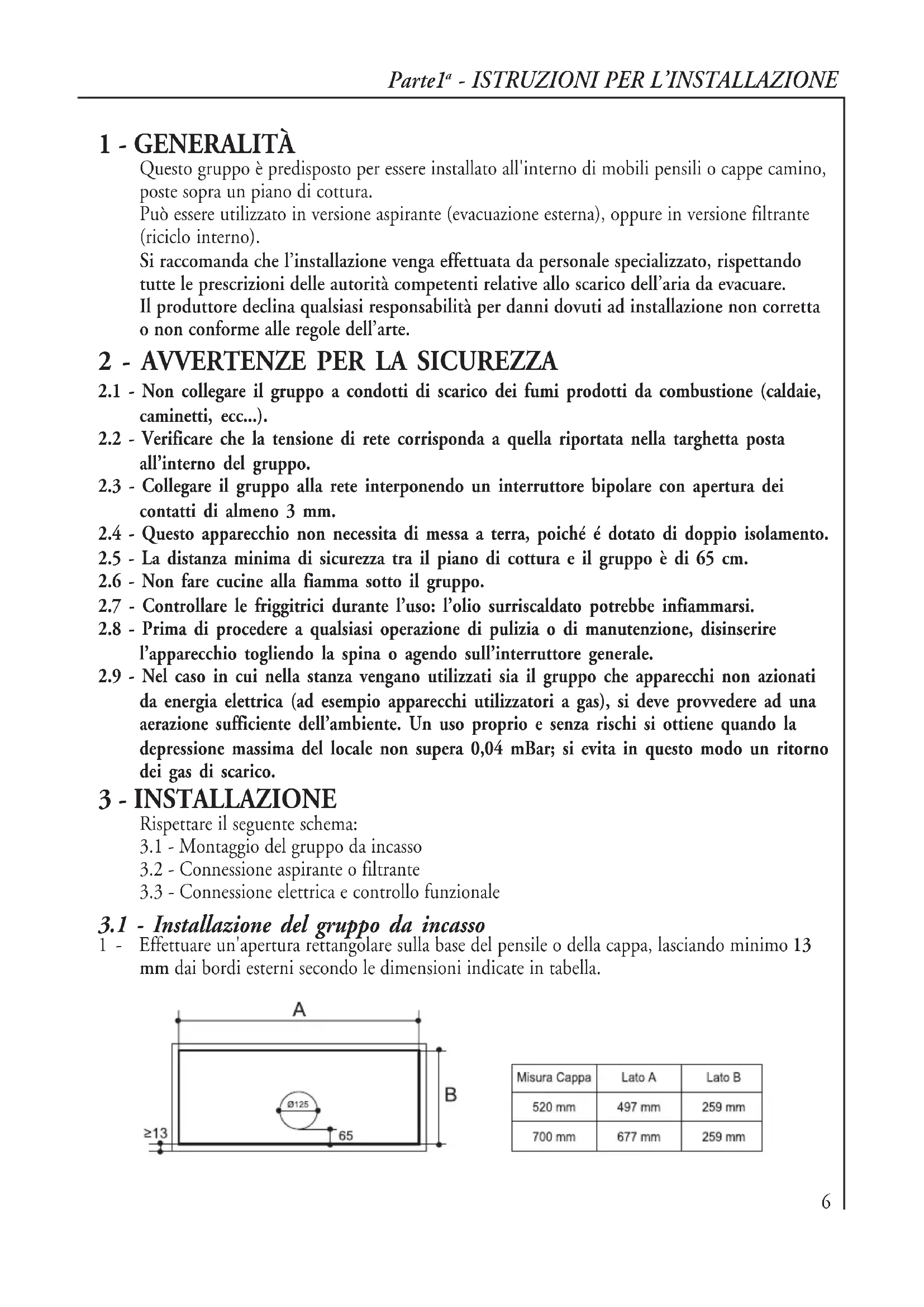 Questo gruppo è predisposto per essere installato all'interno di mobili pensili o cappe camino, poste sopra un piano di cottura. Può essere utilizzato in versione aspirante (evacuazione esterna), oppure in versione filtrante (riciclo interno). Si raccomanda che l’installazione venga effettuata da personale specializzato, rispettando tutte le prescrizioni delle autorità competenti relative allo scarico dell’aria da evacuare. Il produttore declina qualsiasi responsabilità per danni dovuti ad installazione non corretta o non conforme alle regole dell’arte.