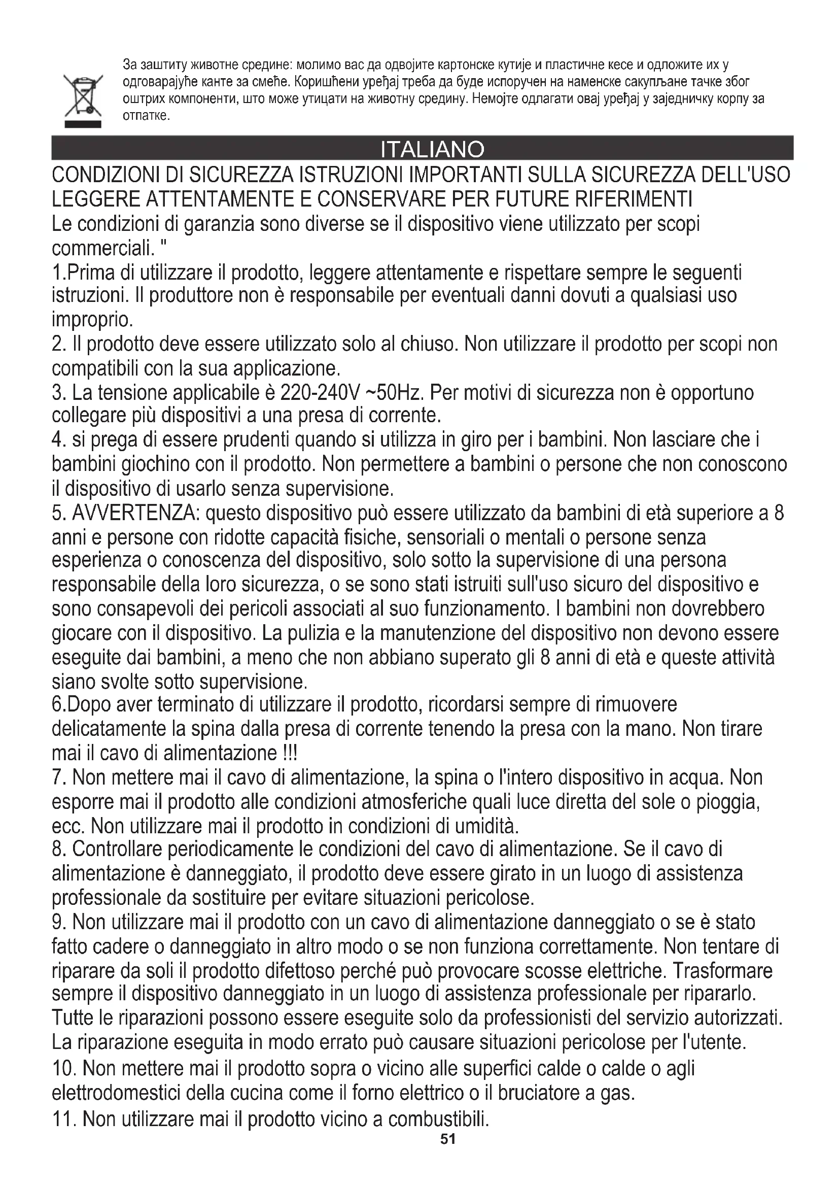 Gli imballi di cartone devono essere smaltiti nel contenitore per la carta. I sacchetti di polietilene (PE) vanno gettati nel contenitore per la plastica. L'apparecchio usato deve essere rottamato presso un centro di raccolta autorizzato, poiché contiene elementi pericolosi che potrebbero costituire una minaccia per l'ambiente. I dispositivi elettrici devono essere resi al fine di evitare il loro riutilizzo. Se il dispositivo contiene una batteria, deve essere rimossa e smaltita separatamente in un punto di raccolta. Prendersi cura dell'ambiente Non gettare l'apparecchio nei contenitori dei rifiuti urbani! 53ﺔﯾرﺎﺟﺗ ضارﻏﻷ زﺎﮭﺟﻟا مادﺧﺗﺳا مﺗ اذإ نﺎﻣﺿﻟا طورﺷ فﻠﺗﺧﺗ ". 2-ﮫﻘﯾﺑطﺗ ﻊﻣ ﻖﻓاوﺗﯾ ﻻ ضرﻏ يﻷ ﺞﺗﻧﻣﻟا مدﺧﺗﺳﺗ ﻻ .لﺧادﻟا ﻲﻓ طﻘﻓ مدﺧﺗﺳﯾ ﺞﺗﻧﻣﻟا.