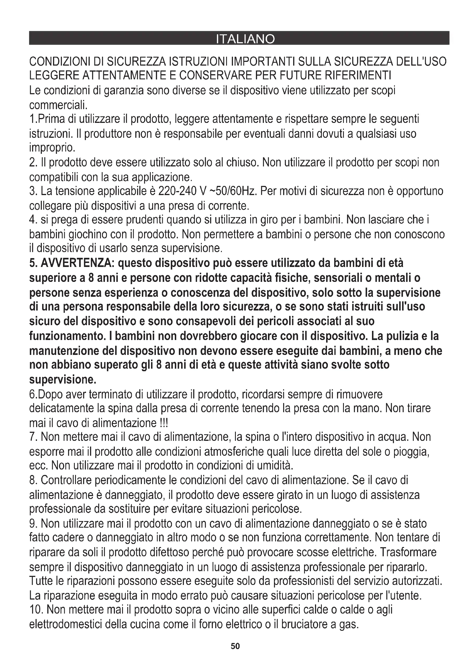ITALIANO Le condizioni di garanzia sono diverse se il dispositivo viene utilizzato per scopi commerciali. 6.Dopo aver terminato di utilizzare il prodotto, ricordarsi sempre di rimuovere delicatamente la spina dalla presa di corrente tenendo la presa con la mano. Non tirare mai il cavo di alimentazione !!! CONDIZIONI DI SICUREZZA ISTRUZIONI IMPORTANTI SULLA SICUREZZA DELL'USO LEGGERE ATTENTAMENTE E CONSERVARE PER FUTURE RIFERIMENTI 1.Prima di utilizzare il prodotto, leggere attentamente e rispettare sempre le seguenti istruzioni. Il produttore non è responsabile per eventuali danni dovuti a qualsiasi uso improprio.