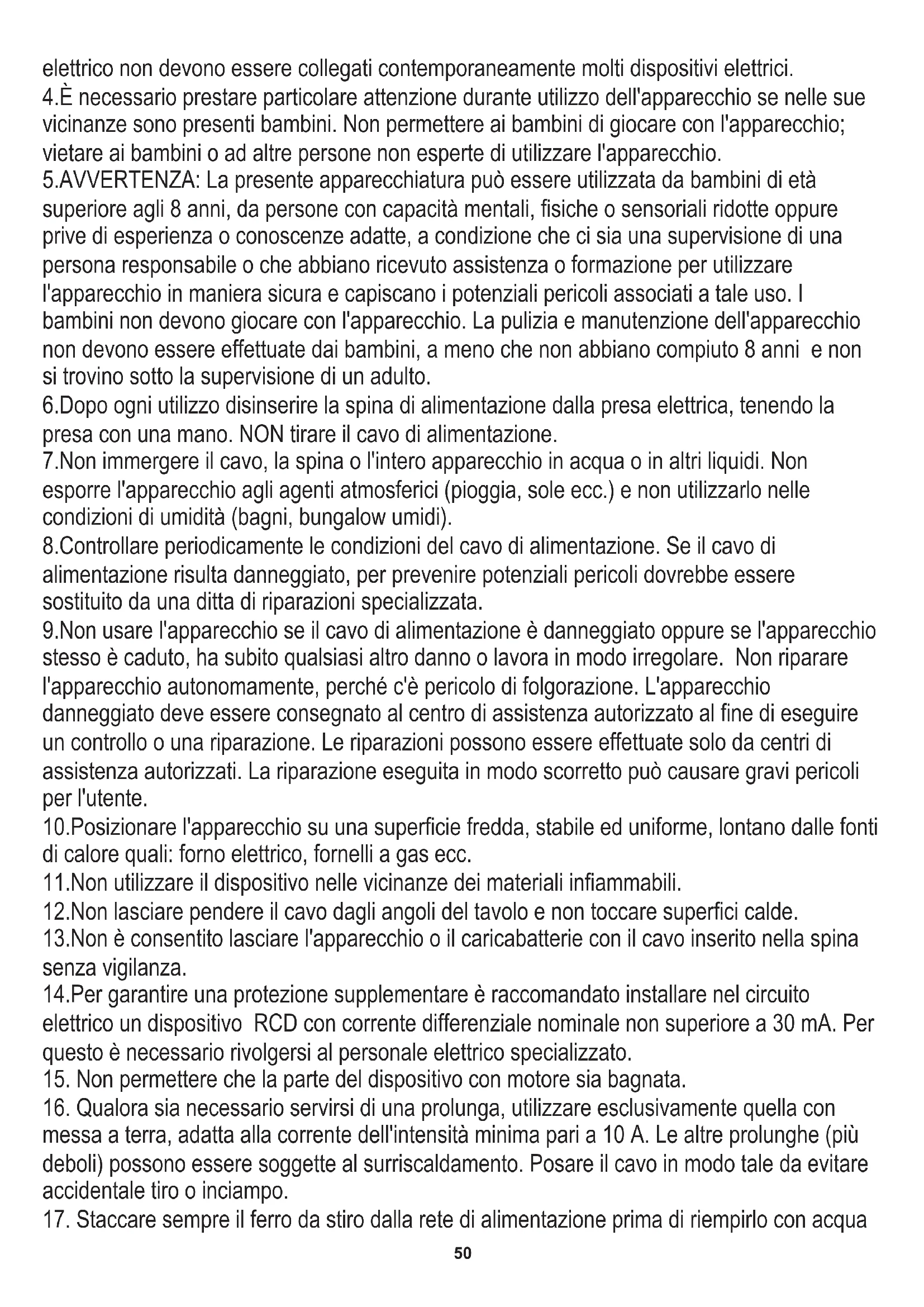 4.È necessario prestare particolare attenzione durante utilizzo dell'apparecchio se nelle sue vicinanze sono presenti bambini. Non permettere ai bambini di giocare con l'apparecchio; vietare ai bambini o ad altre persone non esperte di utilizzare l'apparecchio. 9.Non usare l'apparecchio se il cavo di alimentazione è danneggiato oppure se l'apparecchio stesso è caduto, ha subito qualsiasi altro danno o lavora in modo irregolare. Non riparare l'apparecchio autonomamente, perché c'è pericolo di folgorazione. L'apparecchio danneggiato deve essere consegnato al centro di assistenza autorizzato al fine di eseguire un controllo o una riparazione. Le riparazioni possono essere effettuate solo da centri di assistenza autorizzati. La riparazione eseguita in modo scorretto può causare gravi pericoli per l'utente. 10.Posizionare l'apparecchio su una superficie fredda, stabile ed uniforme, lontano dalle fonti di calore quali: forno elettrico, fornelli a gas ecc. 11.Non utilizzare il dispositivo nelle vicinanze dei materiali infiammabili. 7.Non immergere il cavo, la spina o l'intero apparecchio in acqua o in altri liquidi. Non esporre l'apparecchio agli agenti atmosferici (pioggia, sole ecc.) e non utilizzarlo nelle condizioni di umidità (bagni, bungalow umidi). 8.Controllare periodicamente le condizioni del cavo di alimentazione. Se il cavo di alimentazione risulta danneggiato, per prevenire potenziali pericoli dovrebbe essere sostituito da una ditta di riparazioni specializzata. 14.Per garantire una protezione supplementare è raccomandato installare nel circuito elettrico un dispositivo RCD con corrente differenziale nominale non superiore a 30 mA. Per questo è necessario rivolgersi al personale elettrico specializzato. elettrico non devono essere collegati contemporaneamente molti dispositivi elettrici. 50oppure quando il ferro da stiro non è utilizzato.