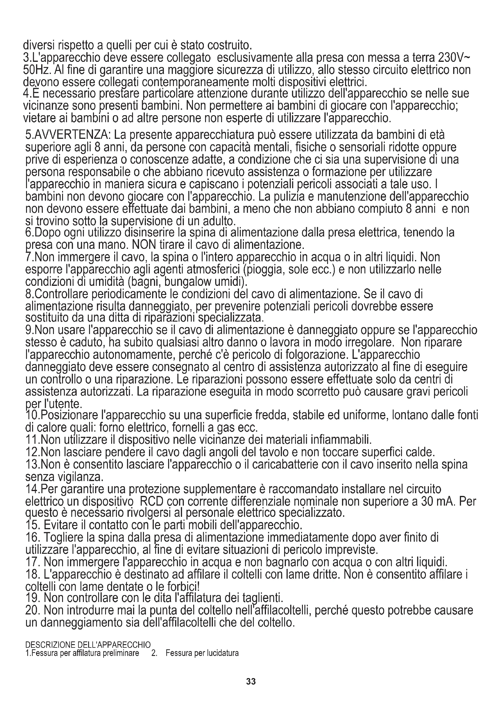 14.Per garantire una protezione supplementare è raccomandato installare nel circuito elettrico un dispositivo RCD con corrente differenziale nominale non superiore a 30 mA. Per questo è necessario rivolgersi al personale elettrico specializzato. 13.Non è consentito lasciare l'apparecchio o il caricabatterie con il cavo inserito nella spina senza vigilanza. 12.Non lasciare pendere il cavo dagli angoli del tavolo e non toccare superfici calde. 11.Non utilizzare il dispositivo nelle vicinanze dei materiali infiammabili. 10.Posizionare l'apparecchio su una superficie fredda, stabile ed uniforme, lontano dalle fonti di calore quali: forno elettrico, fornelli a gas ecc. 9.Non usare l'apparecchio se il cavo di alimentazione è danneggiato oppure se l'apparecchio stesso è caduto, ha subito qualsiasi altro danno o lavora in modo irregolare. Non riparare l'apparecchio autonomamente, perché c'è pericolo di folgorazione. L'apparecchio danneggiato deve essere consegnato al centro di assistenza autorizzato al fine di eseguire un controllo o una riparazione. Le riparazioni possono essere effettuate solo da centri di assistenza autorizzati. La riparazione eseguita in modo scorretto può causare gravi pericoli per l'utente. 8.Controllare periodicamente le condizioni del cavo di alimentazione. Se il cavo di alimentazione risulta danneggiato, per prevenire potenziali pericoli dovrebbe essere sostituito da una ditta di riparazioni specializzata. 7.Non immergere il cavo, la spina o l'intero apparecchio in acqua o in altri liquidi. Non esporre l'apparecchio agli agenti atmosferici (pioggia, sole ecc.) e non utilizzarlo nelle condizioni di umidità (bagni, bungalow umidi). 6.Dopo ogni utilizzo disinserire la spina di alimentazione dalla presa elettrica, tenendo la presa con una mano. NON tirare il cavo di alimentazione. 5.AVVERTENZA: La presente apparecchiatura può essere utilizzata da bambini di età superiore agli 8 anni, da persone con capacità mentali, fisiche o sensoriali ridotte oppure prive di esperienza o conoscenze adatte, a condizione che ci sia una supervisione di una persona responsabile o che abbiano ricevuto assistenza o formazione per utilizzare l'apparecchio in maniera sicura e capiscano i potenziali pericoli associati a tale uso. I bambini non devono giocare con l'apparecchio. La pulizia e manutenzione dell'apparecchio non devono essere effettuate dai bambini, a meno che non abbiano compiuto 8 anni e non si trovino sotto la supervisione di un adulto. 4.È necessario prestare particolare attenzione durante utilizzo dell'apparecchio se nelle sue vicinanze sono presenti bambini. Non permettere ai bambini di giocare con l'apparecchio; vietare ai bambini o ad altre persone non esperte di utilizzare l'apparecchio. 3.L'apparecchio deve essere collegato esclusivamente alla presa con messa a terra 230V~ 50Hz. Al fine di garantire una maggiore sicurezza di utilizzo, allo stesso circuito elettrico non devono essere collegati contemporaneamente molti dispositivi elettrici. diversi rispetto a quelli per cui è stato costruito.34 Potenza max: 60W Potenza: 40W DATI TECNICI Tensione: 230V~ 50Hz Prima di effettuare qualsiasi operazione di pulizia scollegare la spina dalla presa. Pulire la superficie esterna dell'apparecchio con un panno secco. Non immergere l'apparecchio nell'acqua per pulirlo. L'apparecchio non è dotato di contenitore per schegge di metallo, che si formano durante il processo di affilatura. Per eliminarle è necessario rimuovere i tappi di plastica posizionati nella parte inferiore dell'apparecchio e quindi agitarlo leggermente.