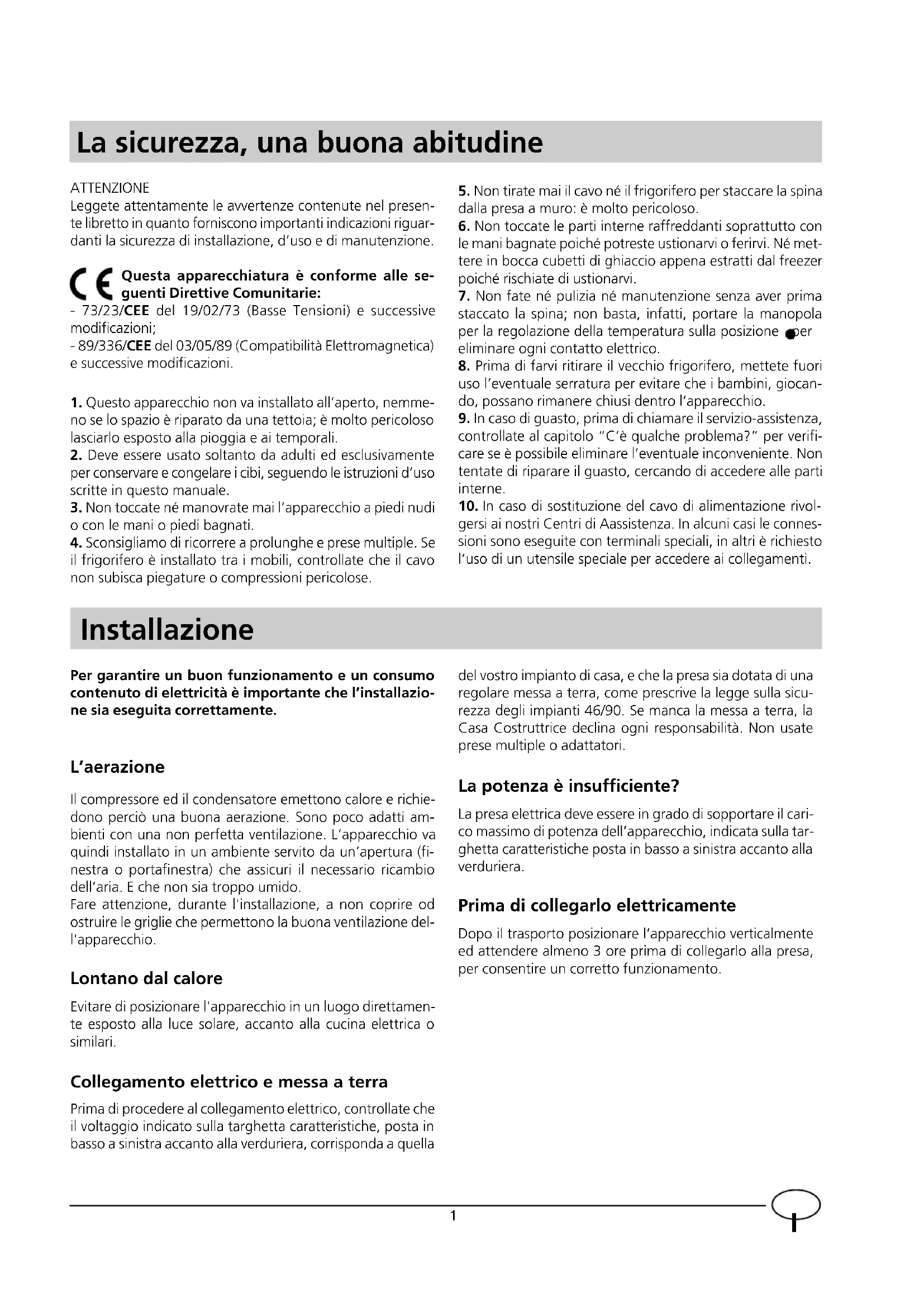 gersi ai nostri Centri di Aassistenza. In alcuni casi le connes- sioni sono eseguite con terminali speciali, in altri è richiesto l’uso di un utensile speciale per accedere ai collegamenti. Installazione Per garantire un buon funzionamento e un consumo contenuto di elettricità è importante che l’installazio- ne sia eseguita correttamente. L’aerazione Il compressore ed il condensatore emettono calore e richie- dono perciò una buona aerazione. Sono poco adatti am- bienti con una non perfetta ventilazione. L’apparecchio va quindi installato in un ambiente servito da un’apertura (fi- nestra o portafinestra) che assicuri il necessario ricambio dell’aria. E che non sia troppo umido. Fare attenzione, durante l'installazione, a non coprire od ostruire le griglie che permettono la buona ventilazione del- l'apparecchio. Lontano dal calore Evitare di posizionare l'apparecchio in un luogo direttamen- te esposto alla luce solare, accanto alla cucina elettrica o similari. Collegamento elettrico e messa a terra Prima di procedere al collegamento elettrico, controllate che il voltaggio indicato sulla targhetta caratteristiche, posta in basso a sinistra accanto alla verduriera, corrisponda a quella del vostro impianto di casa, e che la presa sia dotata di una regolare messa a terra, come prescrive la legge sulla sicu- rezza degli impianti 46/90. Se manca la messa a terra, la Casa Costruttrice declina ogni responsabilità. Non usate prese multiple o adattatori. La potenza è insufficiente? La presa elettrica deve essere in grado di sopportare il cari- co massimo di potenza dell’apparecchio, indicata sulla tar- ghetta caratteristiche posta in basso a sinistra accanto alla verduriera. Prima di collegarlo elettricamente Dopo il trasporto posizionare l’apparecchio verticalmente ed attendere almeno 3 ore prima di collegarlo alla presa, per consentire un corretto funzionamento. ATTENZIONE Leggete attentamente le avvertenze contenute nel presen- te libretto in quanto forniscono importanti indicazioni riguar- danti la sicurezza di installazione, d’uso e di manutenzione. Questa apparecchiatura è conforme alle se- guenti Direttive Comunitarie: - 73/23/CEE del 19/02/73 (Basse Tensioni) e successive modificazioni; - 89/336/CEE del 03/05/89 (Compatibilità Elettromagnetica) e successive modificazioni.