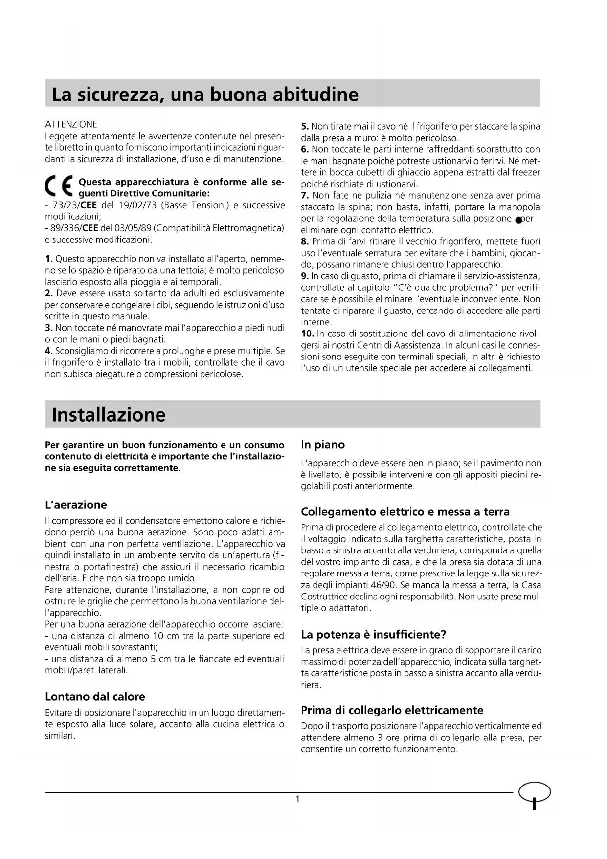 gersi ai nostri Centri di Aassistenza. In alcuni casi le connes- sioni sono eseguite con terminali speciali, in altri è richiesto l’uso di un utensile speciale per accedere ai collegamenti. Installazione Per garantire un buon funzionamento e un consumo contenuto di elettricità è importante che l’installazio- ne sia eseguita correttamente. L’aerazione Il compressore ed il condensatore emettono calore e richie- dono perciò una buona aerazione. Sono poco adatti am- bienti con una non perfetta ventilazione. L’apparecchio va quindi installato in un ambiente servito da un’apertura (fi- nestra o portafinestra) che assicuri il necessario ricambio dell’aria. E che non sia troppo umido. Fare attenzione, durante l'installazione, a non coprire od ostruire le griglie che permettono la buona ventilazione del- l'apparecchio. Per una buona aerazione dell'apparecchio occorre lasciare: - una distanza di almeno 10 cm tra la parte superiore ed eventuali mobili sovrastanti; - una distanza di almeno 5 cm tra le fiancate ed eventuali mobili/pareti laterali. Lontano dal calore Evitare di posizionare l'apparecchio in un luogo direttamen- te esposto alla luce solare, accanto alla cucina elettrica o similari. In piano L'apparecchio deve essere ben in piano; se il pavimento non è livellato, è possibile intervenire con gli appositi piedini re- golabili posti anteriormente. Collegamento elettrico e messa a terra Prima di procedere al collegamento elettrico, controllate che il voltaggio indicato sulla targhetta caratteristiche, posta in basso a sinistra accanto alla verduriera, corrisponda a quella del vostro impianto di casa, e che la presa sia dotata di una regolare messa a terra, come prescrive la legge sulla sicurez- za degli impianti 46/90. Se manca la messa a terra, la Casa Costruttrice declina ogni responsabilità. Non usate prese mul- tiple o adattatori. La potenza è insufficiente? La presa elettrica deve essere in grado di sopportare il carico massimo di potenza dell’apparecchio, indicata sulla targhet- ta caratteristiche posta in basso a sinistra accanto alla verdu- riera. Prima di collegarlo elettricamente Dopo il trasporto posizionare l’apparecchio verticalmente ed attendere almeno 3 ore prima di collegarlo alla presa, per consentire un corretto funzionamento. ATTENZIONE Leggete attentamente le avvertenze contenute nel presen- te libretto in quanto forniscono importanti indicazioni riguar- danti la sicurezza di installazione, d’uso e di manutenzione. Questa apparecchiatura è conforme alle se- guenti Direttive Comunitarie: - 73/23/CEE del 19/02/73 (Basse Tensioni) e successive modificazioni; - 89/336/CEE del 03/05/89 (Compatibilità Elettromagnetica) e successive modificazioni.