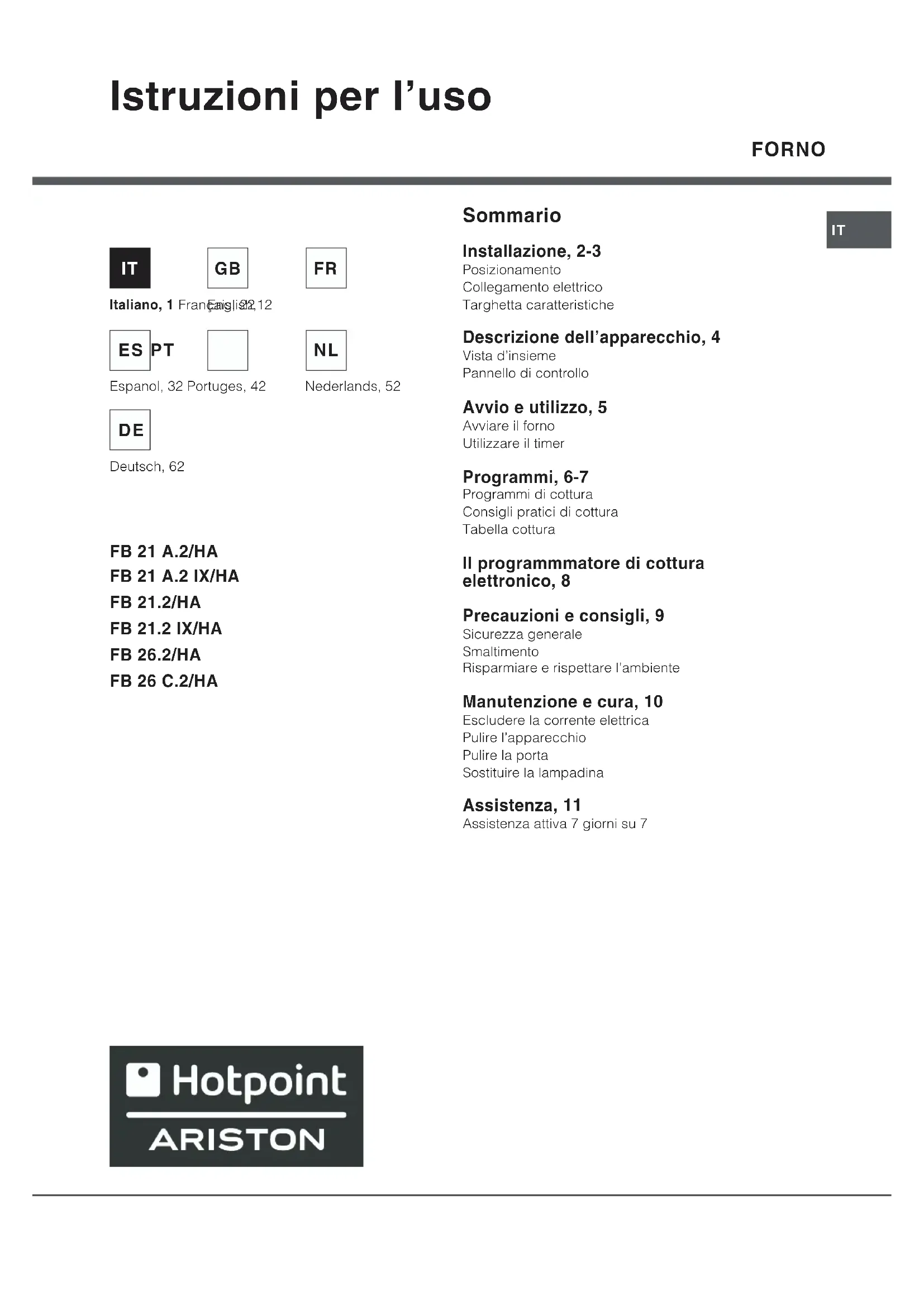 Assistenza Prima di contattare lAssistenza: Verificare se lanomalia può essere risolta autonomamente (vedi Anomalie e Rimedi); Riavviare il programma per controllare se linconveniente è stato ovviato; In caso negativo, contattare il Servizio Assistenza Tecnico Autorizzato. Non ricorrere mai a tecnici non autorizzati. Comunicare: Il tipo di anomalia; Il modello della macchina (Mod.) Il numero di serie (S/N) Queste ultime informazioni si trovano sulla targhetta caratteristiche posta sullapparecchio Assistenza attiva 7 giorni su 7 In caso di necessità dintervento chiamare il Numero Unico Nazionale 199.199.199*. Un operatore sarà a completa disposizione per fissare un appuntamento con il Centro Assistenza Tecnico Autorizzato più vicino al luogo da cui si chiama. È attivo 7 giorni su 7, sabato e domenica compresi, e non lascia mai inascoltata una richiesta. *Al costo di 14,26 centesimi di Euro al minuto(iva inclusa) dal Lun. al Ven. dalle 08:00 alle 18:30, il Sab. dalle 08:00 alle 13:00 e di 5,58 centesimi di Euro al minuto (iva inclusa) dal Lun. al Ven. dalle 18:30 alle 08:00, il Sab. dalle 13:00 alle 08:00 e i giorni festivi, per chi chiama da telefono fisso. Per chi chiama da radiomobile le tariffe sono legate al piano tariffario delloperatore telefonico utilizzato. Le suddette tariffe potrebbero essere soggette a variazione da parte delloperatore telefonico; per maggiori informazioni consultare il sito www.aristonchannel.com.FB 21 A.2/HA FB 21 A.2 IX/HA FB 21.2/HA FB 21.2 IX/HA FB 26.2/HA FB 26 C.2/HA Contents Installation, 13-14 Positioning Electrical connections Data plate Description of the appliance, 15 Overall view Control panel Start-up and use, 16 Starting the oven How to use the timer Cooking modes, 17-18 Cooking modes Practical cooking advice Cooking advice table The electronic cooking programmer, 19 Precautions and tips, 20 General safety Disposal Respecting and conserving the environment Assistance Maintenance and care, 21 Switching the appliance off Cleaning the appliance Cleaning the oven door Replacing the light bulb Operating Instructions OVEN Français, 22 Espanol, 32 Portuges, 42