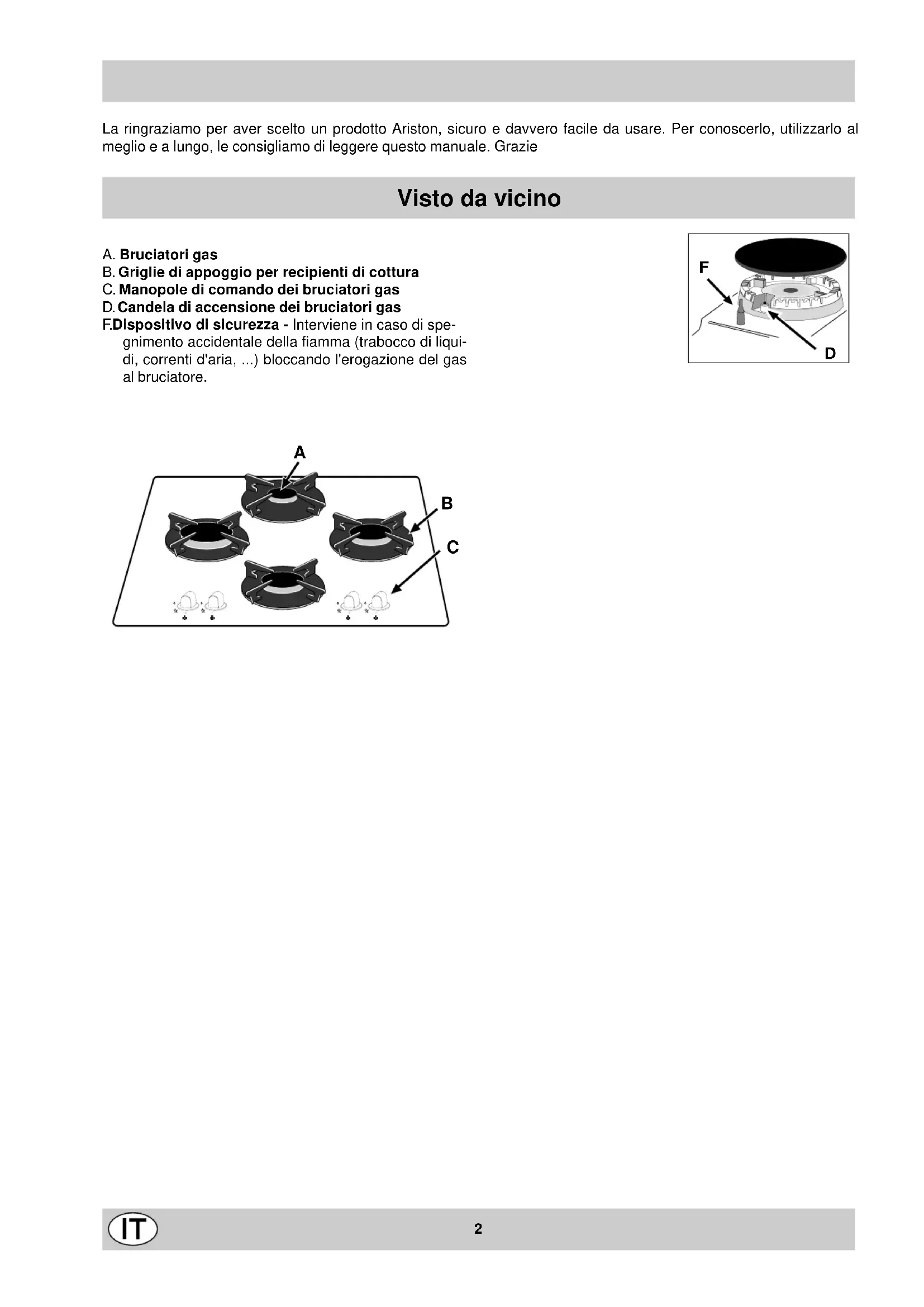 A. Bruciatori gas B. Griglie di appoggio per recipienti di cottura C. Manopole di comando dei bruciatori gas D. Candela di accensione dei bruciatori gas F. Dispositivo di sicurezza - Interviene in caso di spe- gnimento accidentale della fiamma (trabocco di liqui- di, correnti d'aria, ...) bloccando l'erogazione del gas al bruciatore. Visto da vicino