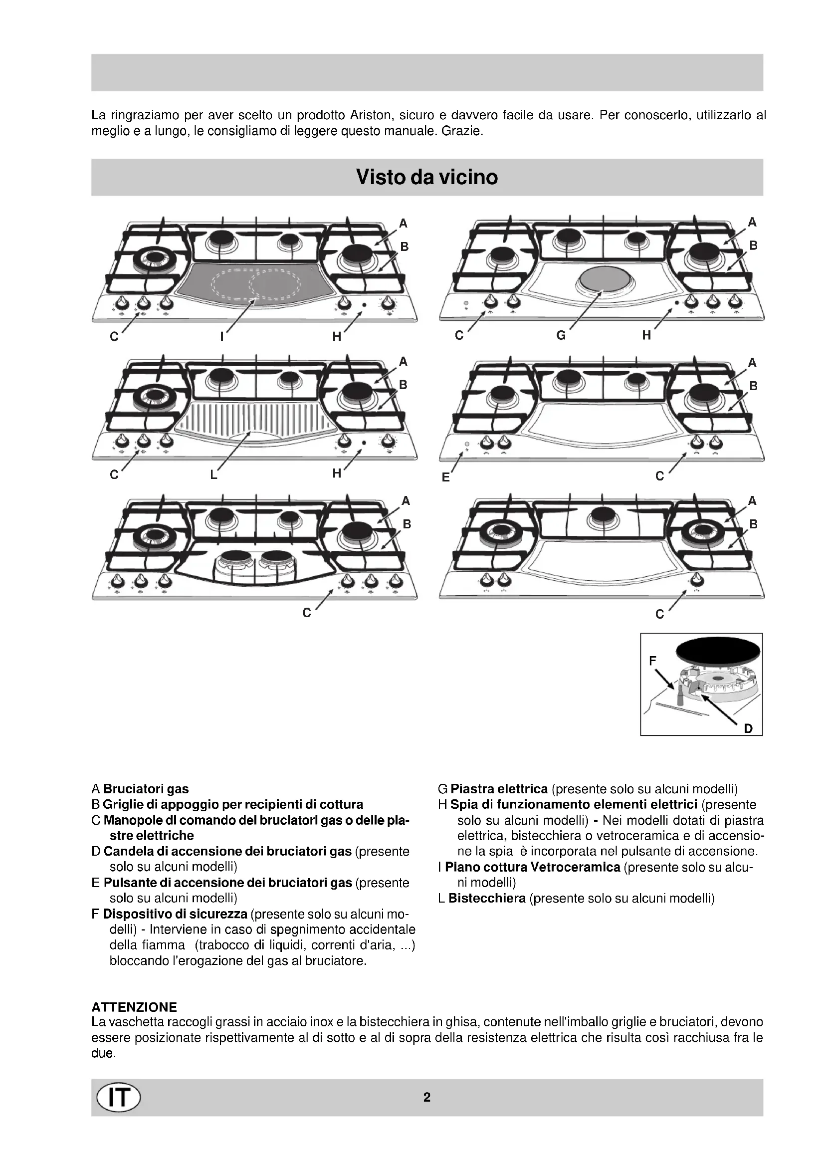 La ringraziamo per aver scelto un prodotto Ariston, sicuro e davvero facile da usare. Per conoscerlo, utilizzarlo al meglio e a lungo, le consigliamo di leggere questo manuale. Grazie. Visto da vicino G Piastra elettrica (presente solo su alcuni modelli) H Spia di funzionamento elementi elettrici (presente solo su alcuni modelli) - Nei modelli dotati di piastra elettrica, bistecchiera o vetroceramica e di accensio- ne la spia è incorporata nel pulsante di accensione. I Piano cottura Vetroceramica (presente solo su alcu- ni modelli) L Bistecchiera (presente solo su alcuni modelli) A Bruciatori gas B Griglie di appoggio per recipienti di cottura C Manopole di comando dei bruciatori gas o delle pia- stre elettriche D Candela di accensione dei bruciatori gas (presente solo su alcuni modelli) E Pulsante di accensione dei bruciatori gas (presente solo su alcuni modelli) F Dispositivo di sicurezza (presente solo su alcuni mo- delli) - Interviene in caso di spegnimento accidentale della fiamma (trabocco di liquidi, correnti d'aria, ...) bloccando l'erogazione del gas al bruciatore. ATTENZIONE La vaschetta raccogli grassi in acciaio inox e la bistecchiera in ghisa, contenute nell'imballo griglie e bruciatori, devono essere posizionate rispettivamente al di sotto e al di sopra della resistenza elettrica che risulta così racchiusa fra le due.