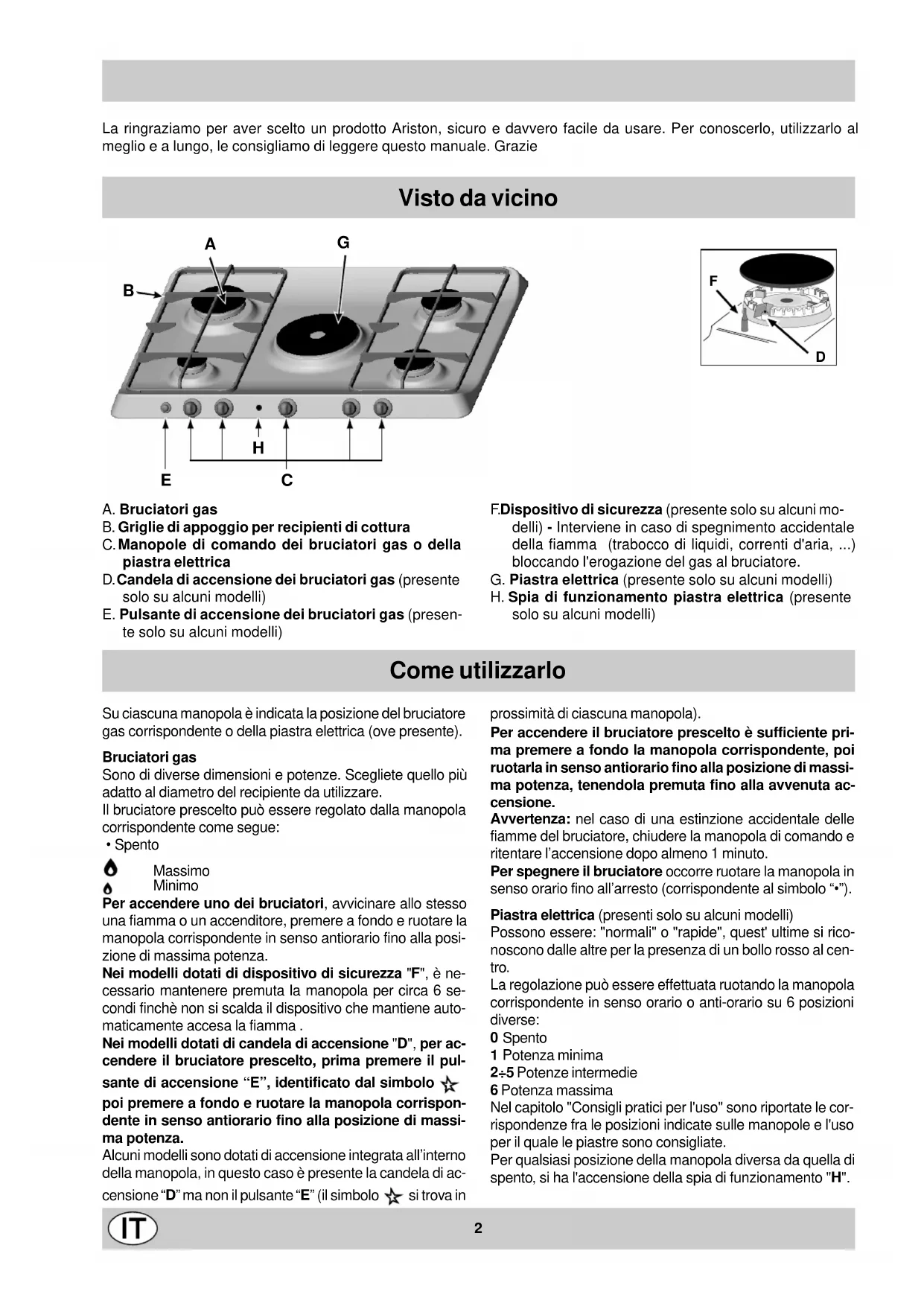 La ringraziamo per aver scelto un prodotto Ariston, sicuro e davvero facile da usare. Per conoscerlo, utilizzarlo al meglio e a lungo, le consigliamo di leggere questo manuale. Grazie A. Bruciatori gas B. Griglie di appoggio per recipienti di cottura C. Manopole di comando dei bruciatori gas o della piastra elettrica D. Candela di accensione dei bruciatori gas (presente solo su alcuni modelli) E. Pulsante di accensione dei bruciatori gas (presen- te solo su alcuni modelli) Su ciascuna manopola è indicata la posizione del bruciatore gas corrispondente o della piastra elettrica (ove presente). Bruciatori gas Sono di diverse dimensioni e potenze. Scegliete quello più adatto al diametro del recipiente da utilizzare. Il bruciatore prescelto può essere regolato dalla manopola corrispondente come segue: