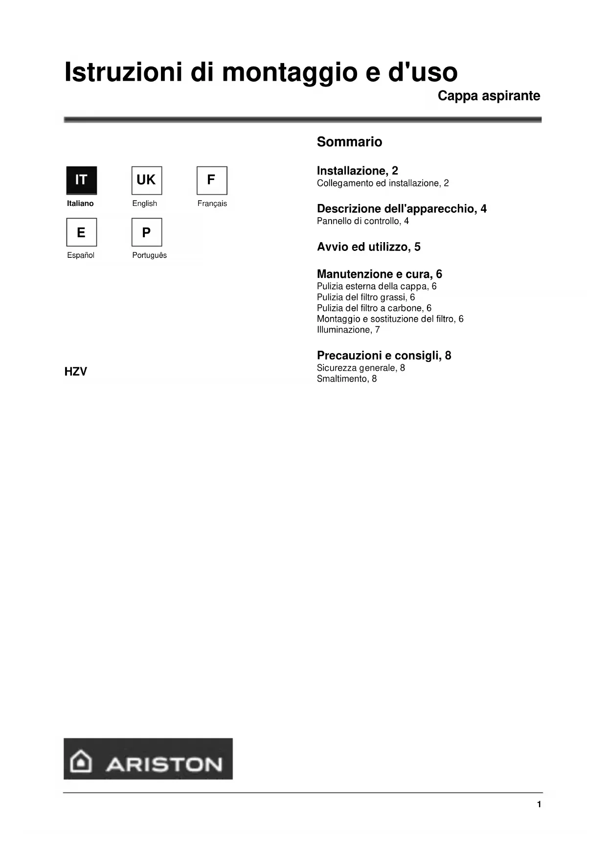 HZV Sommario Installazione, 2 Collegamento ed installazione, 2 Descrizione dell'apparecchio, 4 Pannello di controllo, 4 Avvio ed utilizzo, 5 Manutenzione e cura, 6 Pulizia esterna della cappa, 6 Pulizia del filtro grassi, 6 Pulizia del filtro a carbone, 6 Montaggio e sostituzione del filtro, 6 Illuminazione, 7 Precauzioni e consigli, 8 Sicurezza generale, 8 Smaltimento, 82