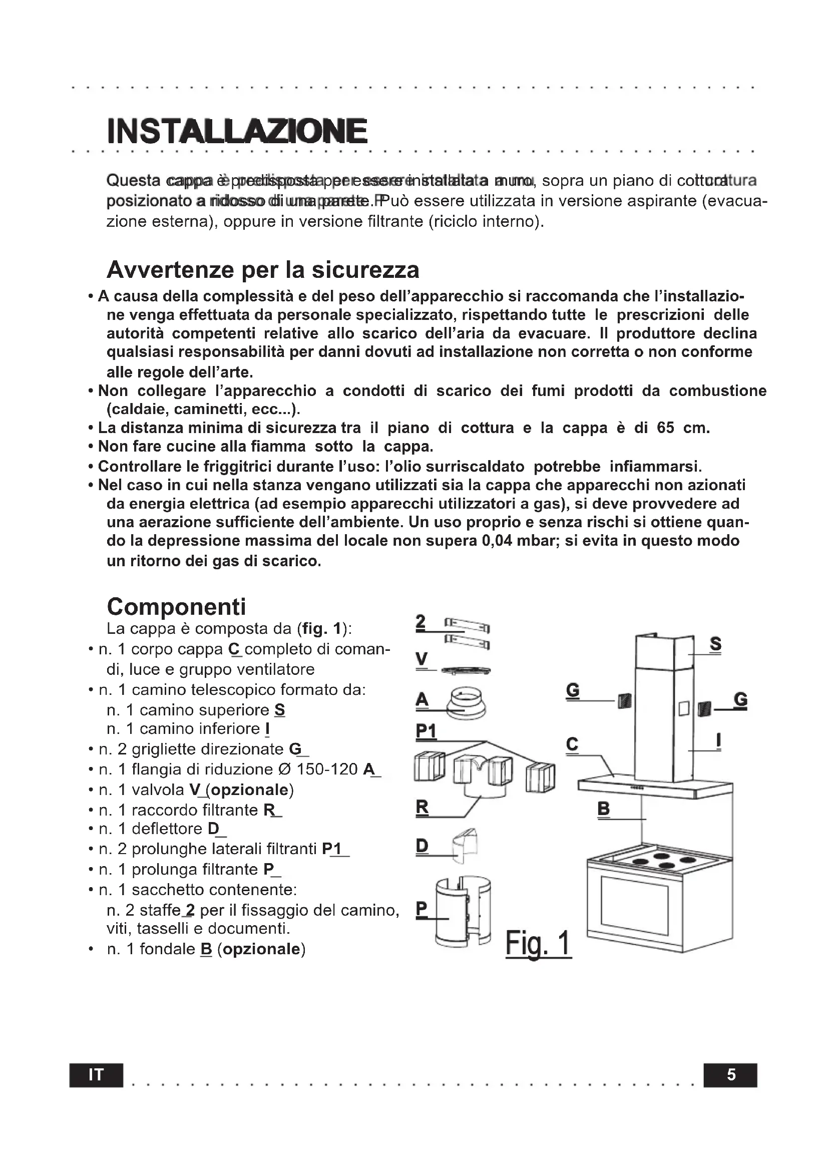 Fig. 1 ○○○○○○○○○○○○○○○○○○○○○○○○○○○○○○○○○○○○○○○○○○○○○○○ INSTALLAZIONE Questa cappa è predisposta per essere installata a muro, sopra un piano di cottura posizionato a ridosso di una parete. Può essere utilizzata in versione aspirante (evacua- zione esterna), oppure in versione filtrante (riciclo interno). Avvertenze per la sicurezza