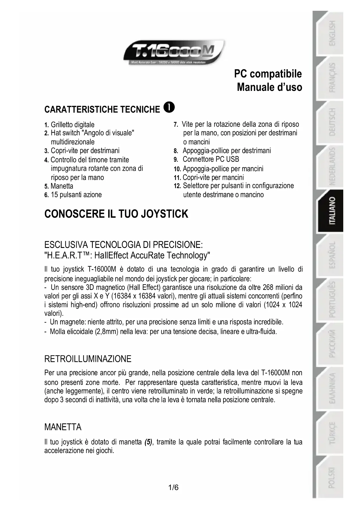 ESCLUSIVA TECNOLOGIA DI PRECISIONE: "H.E.A.R.T™: HallEffect AccuRate Technology" Il tuo joystick T-16000M è dotato di una tecnologia in grado di garantire un livello di precisione ineguagliabile nel mondo dei joystick per giocare; in particolare: - Un sensore 3D magnetico (Hall Effect) garantisce una risoluzione da oltre 268 milioni da valori per gli assi X e Y (16384 x 16384 valori), mentre gli attuali sistemi concorrenti (perfino i sistemi high-end) offrono risoluzioni prossime ad un solo milione di valori (1024 x 1024 valori). - Un magnete: niente attrito, per una precisione senza limiti e una risposta incredibile. - Molla elicoidale (2,8mm) nella leva: per una tensione decisa, lineare e ultra-fluida.