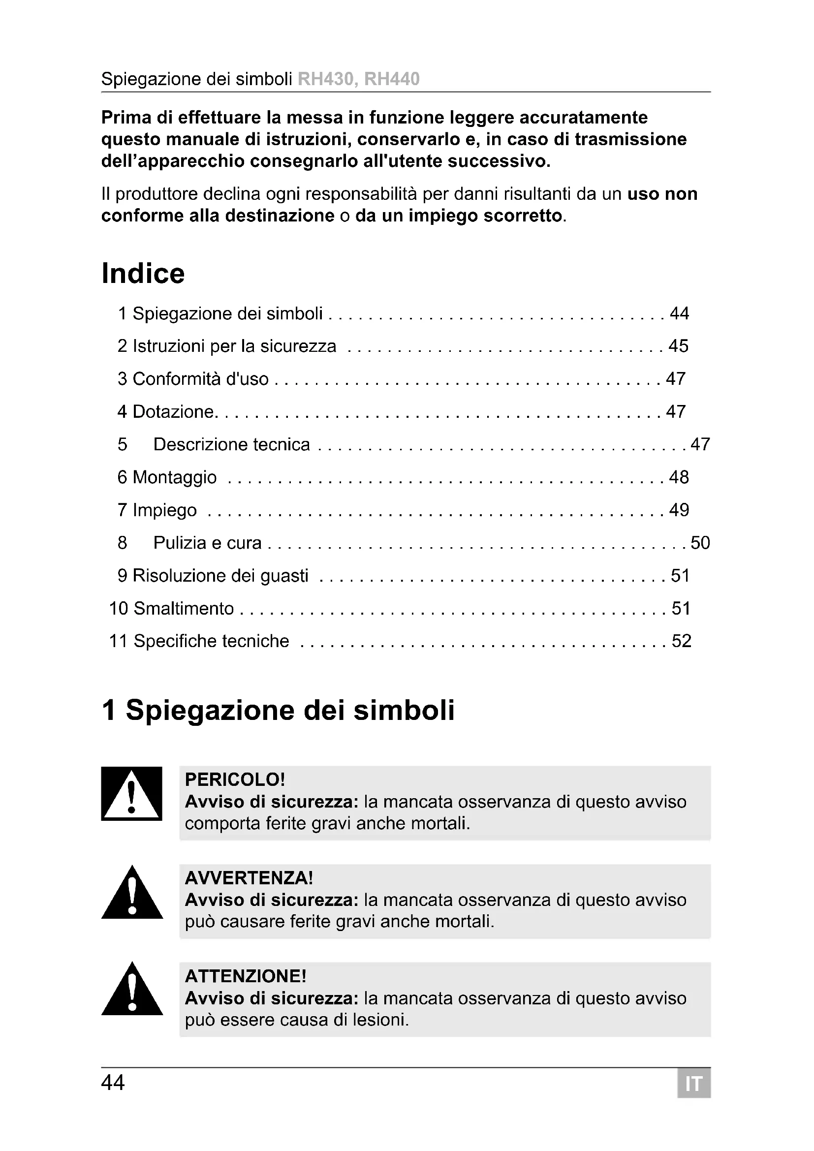 PERICOLO! Avviso di sicurezza: la mancata osservanza di questo avviso comporta ferite gravi anche mortali. AVVERTENZA! Avviso di sicurezza: la mancata osservanza di questo avviso può causare ferite gravi anche mortali. ATTENZIONE! Avviso di sicurezza: la mancata osservanza di questo avviso può essere causa di lesioni.IT RH430, RH440 Istruzioni per la sicurezza