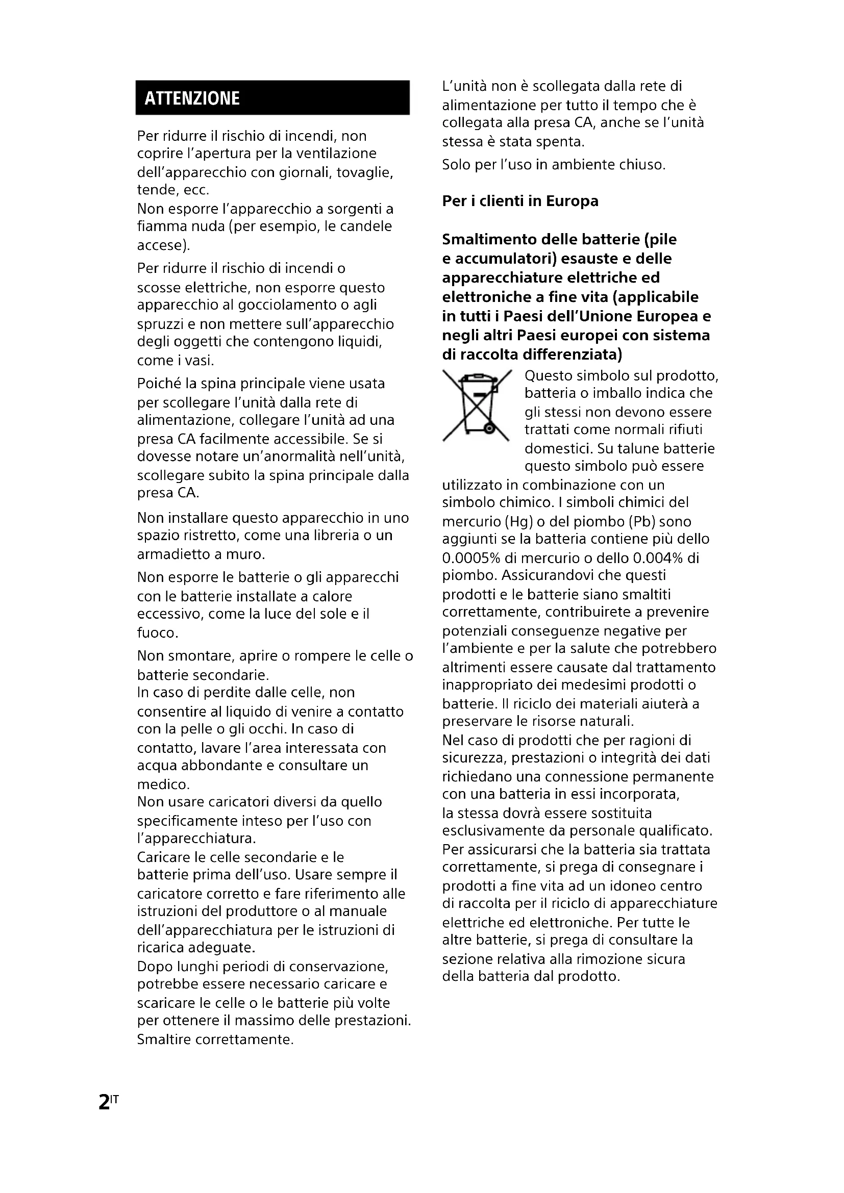 GTK-XB60/XB90.4-697-227-32(1) ATTENZIONE Per ridurre il rischio di incendi, non coprire l’apertura per la ventilazione dell’apparecchio con giornali, tovaglie, tende, ecc. Non esporre l’apparecchio a sorgenti a fiamma nuda (per esempio, le candele accese). Per ridurre il rischio di incendi o scosse elettriche, non esporre questo apparecchio al gocciolamento o agli spruzzi e non mettere sull’apparecchio degli oggetti che contengono liquidi, come i vasi. Poiché la spina principale viene usata per scollegare l’unità dalla rete di alimentazione, collegare l’unità ad una presa CA facilmente accessibile. Se si dovesse notare un’anormalità nell’unità, scollegare subito la spina principale dalla presa CA. Non installare questo apparecchio in uno spazio ristretto, come una libreria o un armadietto a muro. Non esporre le batterie o gli apparecchi con le batterie installate a calore eccessivo, come la luce del sole e il fuoco. Non smontare, aprire o rompere le celle o batterie secondarie. In caso di perdite dalle celle, non consentire al liquido di venire a contatto con la pelle o gli occhi. In caso di contatto, lavare l’area interessata con acqua abbondante e consultare un medico. Non usare caricatori diversi da quello specificamente inteso per l’uso con l’apparecchiatura. Caricare le celle secondarie e le batterie prima dell’uso. Usare sempre il caricatore corretto e fare riferimento alle istruzioni del produttore o al manuale dell’apparecchiatura per le istruzioni di ricarica adeguate. Dopo lunghi periodi di conservazione, potrebbe essere necessario caricare e scaricare le celle o le batterie più volte per ottenere il massimo delle prestazioni. Smaltire correttamente. L’unità non è scollegata dalla rete di alimentazione per tutto il tempo che è collegata alla presa CA, anche se l’unità stessa è stata spenta. Solo per l’uso in ambiente chiuso. Per i clienti in Europa Smaltimento delle batterie (pile e accumulatori) esauste e delle apparecchiature elettriche ed elettroniche a fine vita (applicabile in tutti i Paesi dell’Unione Europea e negli altri Paesi europei con sistema di raccolta differenziata) Questo simbolo sul prodotto, batteria o imballo indica che gli stessi non devono essere trattati come normali rifiuti domestici. Su talune batterie questo simbolo può essere utilizzato in combinazione con un simbolo chimico. I simboli chimici del mercurio (Hg) o del piombo (Pb) sono aggiunti se la batteria contiene più dello 0.0005% di mercurio o dello 0.004% di piombo. Assicurandovi che questi prodotti e le batterie siano smaltiti correttamente, contribuirete a prevenire potenziali conseguenze negative per l’ambiente e per la salute che potrebbero altrimenti essere causate dal trattamento inappropriato dei medesimi prodotti o batterie. Il riciclo dei materiali aiuterà a preservare le risorse naturali. Nel caso di prodotti che per ragioni di sicurezza, prestazioni o integrità dei dati richiedano una connessione permanente con una batteria in essi incorporata, la stessa dovrà essere sostituita esclusivamente da personale qualificato. Per assicurarsi che la batteria sia trattata correttamente, si prega di consegnare i prodotti a fine vita ad un idoneo centro di raccolta per il riciclo di apparecchiature elettriche ed elettroniche. Per tutte le altre batterie, si prega di consultare la sezione relativa alla rimozione sicura della batteria dal prodotto.3
