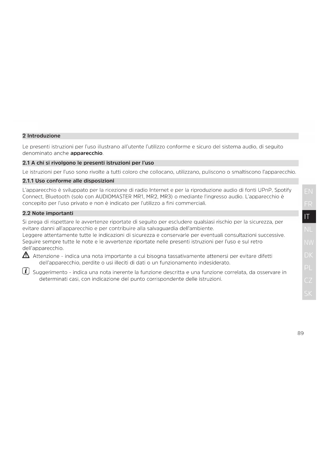 L'apparecchio è sviluppato per la ricezione di radio Internet e per la riproduzione audio di fonti UPnP, Spotify Connect, Bluetooth (solo con AUDIOMASTER MR1, MR2, MR3) o mediante l'ingresso audio. L'apparecchio è concepito per l’uso privato e non è indicato per l'utilizzo a fini commerciali.