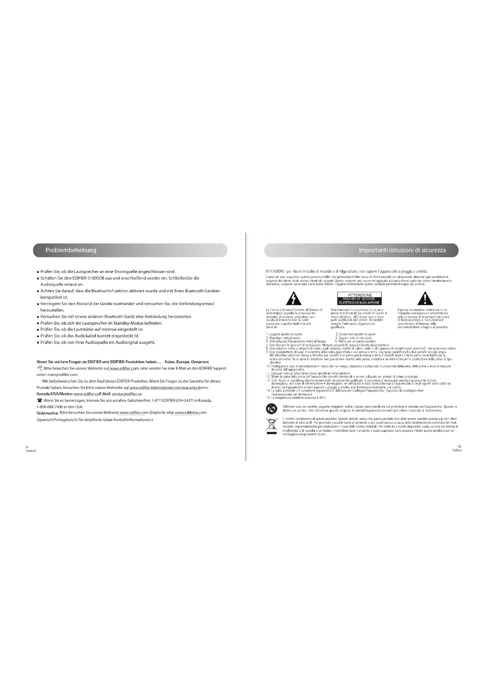 Grazie per aver acquistato questo prodotto Edifier. Da generazioni Edifier cerca di offrire prodotti con altoparlanti alimentati per soddisfare le esigenze del cliente finale anche i clienti più esigenti. Questo prodotto può essere un'aggiunta alla prestazione audio del vostro intrattenimento domestico, computer personale e mini home theater. Leggere attentamente questo manuale peravere il meglio dal sistema. La freccia a forma di fulmine all’interno di un triangolo segnala la presenza nel prodotto di tensione pericolosa non isolata di intensità tale da poter provocare scariche elettriche alle persone.Non rimuovere l a copertura (o la parte posteriore)in modo da evitare il rischio di shock elettrico. All'interno non vi sono parti sostituibili dall'utente. Richiedete sempre l'intervento di personale qualificato. Il punto esclamativo contenuto in un triangolo costituisce un avvertimento della presenza di importanti istruzioni di funzionamento e manutenzione (assistenza) all’interno della documentazione allegata al prodotto.Altoparlante passivo Altoparlante attivo Ricevitore a infrarossi Telecomando Cavo audio RCA - RCA stereo Cavo audio RCA - 3,5mm stereo Cavo di collegamento degli altoparlanti Cavo ingresso fibra ottica User manual | Manuel d’utilisateur | Manual de usuario | Bedienungsanleitung | Manuale dell’utente | Manual do utilizadorS1000DBMultimedia Speaker Manuale d’istruzioni