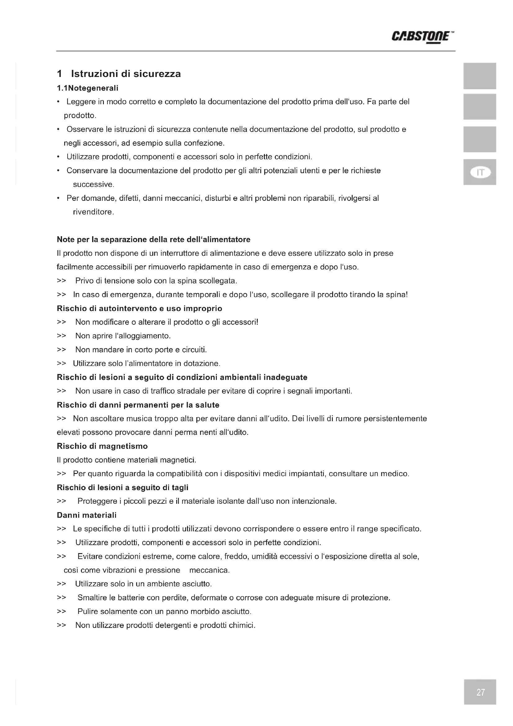 - Perdomande,difetti,dannimeccanici,disturbiealtriprobleminonriparabili,rivolgersial rivenditore. Note per la separazione della rete dell‘alimentatore Ilprodottonondisponediuninterruttoredialimentazioneedeveessereutilizzatosoloinprese facilmenteaccessibiliperrimuoverlorapidamenteincasodiemergenzaedopol‘uso. >> Privoditensionesoloconlaspinascollegata. >> Incasodiemergenza,durantetemporaliedopol‘uso,scollegareilprodottotirandolaspina! Rischio di autointervento e uso improprio >> Nonmodicareoalterareilprodottoogliaccessori! >> Nonaprirel‘alloggiamento. >> Nonmandareincortoporteecircuiti. >> Utilizzare solo l’alimentatore in dotazione. Rischio di lesioni a seguito di condizioni ambientali inadeguate >> Nonusareincasoditrafcostradaleperevitaredicoprireisegnaliimportanti. Rischio di danni permanenti per la salute >> Nonascoltaremusicatroppoaltaperevitaredanniall‘udito.Deilivellidirumorepersistentemente elevatipossonoprovocaredannipermanentiall‘udito. Rischio di magnetismo Ilprodottocontienematerialimagnetici. >> Perquantoriguardalacompatibilitàconidispositivimediciimpiantati,consultareunmedico. Rischio di lesioni a seguito di tagli >> Proteggereipiccolipezzieilmaterialeisolantedall‘usononintenzionale. Danni materiali >> Lespecichedituttiiprodottiutilizzatidevonocorrispondereoessereentroilrangespecicato. >> Utilizzareprodotti,componentieaccessorisoloinperfettecondizioni. >> Evitarecondizioniestreme,comecalore,freddo,umiditàeccessiviol‘esposizionedirettaalsole, cosìcomevibrazioniepressione meccanica. >> Utilizzare solo in un ambiente asciutto. >> Smaltirelebatterieconperdite,deformateocorroseconadeguatemisurediprotezione. >> Puliresolamenteconunpannomorbidoasciutto. >> Nonutilizzareprodottidetergentieprodottichimici.Istruzioni per l‘uso