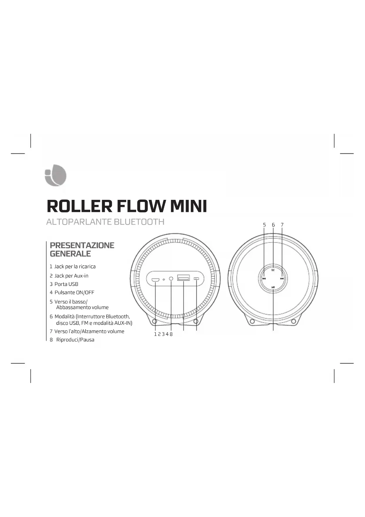 1999/5/CE. Garanzia della batteria. La batteria è un materiale di consumo e, come tale, ha una garanzia di 12 mesi.roller flOW MINI Altavoz bluetooth APRESENTAÇÃO GERAL 1 Entrada do carregador 2 Entrada Aux 3 Porta USB 4 Botão Ligado/Desligado 5 Anterior/Volume menos 6 Modo (Bluetooth, disco USB, FM e estado AUX) 7 Seguinte/Volume mais 8 Reproduzir/Pausar