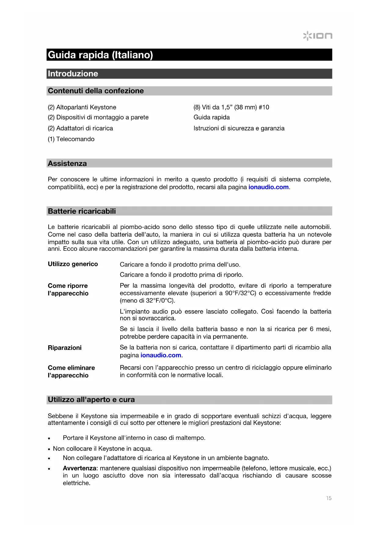 Guida rapida (Italiano) Introduzione Contenuti della confezione (2) Altoparlanti Keystone (2) Dispositivi di montaggio a parete (2) Adattatori di ricarica (1) Telecomando (8) Viti da 1,5” (38 mm) #10 Guida rapida Istruzioni di sicurezza e garanzia Assistenza Per conoscere le ultime informazioni in merito a questo prodotto (i requisiti di sistema complete, compatibilità, ecc) e per la registrazione del prodotto, recarsi alla pagina ionaudio.com. Batterie ricaricabili Le batterie ricaricabili al piombo-acido sono dello stesso tipo di quelle utilizzate nelle automobili. Come nel caso della batteria dell'auto, la maniera in cui si utilizza questa batteria ha un notevole impatto sulla sua vita utile. Con un utilizzo adeguato, una batteria al piombo-acido può durare per anni. Ecco alcune raccomandazioni per garantire la massima durata dalla batteria interna. Utilizzo generico Caricare a fondo il prodotto prima dell'uso. Caricare a fondo il prodotto prima di riporlo. Come riporre l’apparecchio Per la massima longevità del prodotto, evitare di riporlo a temperature eccessivamente elevate (superiori a 90°F/32°C) o eccessivamente fredde (meno di 32°F/0°C). L'impianto audio può essere lasciato collegato. Così facendo la batteria non si sovraccarica. Se si lascia il livello della batteria basso e non la si ricarica per 6 mesi, potrebbe perdere capacità in via permanente. Riparazioni Se la batteria non si carica, contattare il dipartimento parti di ricambio alla pagina ionaudio.com. Come eliminare l’apparecchio Recarsi con l’apparecchio presso un centro di riciclaggio oppure eliminarlo in conformità con le normative locali. Utilizzo all'aperto e cura Sebbene il Keystone sia impermeabile e in grado di sopportare eventuali schizzi d'acqua, leggere attentamente i consigli di cui sotto per ottenere le migliori prestazioni dal Keystone: