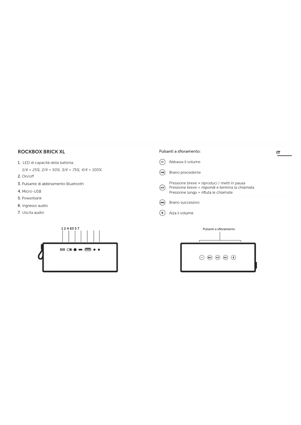 1RB5500 Manual v2.indd 21-22 22/09/2017 09:33PRONTO ALL’ASCOLTO? ECCO COME DEVI FARE: 1. Carica l’altoparlante con il cavo Micro USBI LED della capacità della batteria si illuminano mentre l’altoparlan-te è in carica e si spengono al termine della ricarica.2. Accendi l’altoparlante Premi il tasto Bluetooth per 3 secondi. Quando i pulsanti lam-peggiano di bianco, l’altoparlante è pronto per la connessione Bluetooth.3. Collega il dispositivoAccendi il Bluetooth e seleziona l’altoparlante dall’elenco dei dispositivi disponibili. I pulsanti diventano bianchi fissi; al termine della connessione sentirai un segnale acustico.