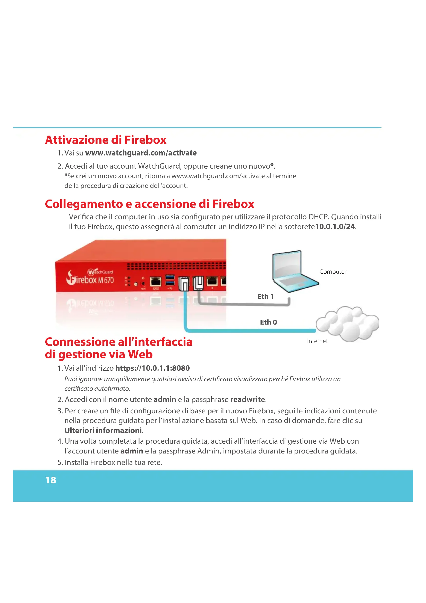 *Se crei un nuovo account, ritorna a www.watchguard.com/activate al termine della procedura di creazione dell’account. Collegamento e accensione di Firebox Verica che il computer in uso sia congurato per utilizzare il protocollo DHCP. Quando installi il tuo Firebox, questo assegnerà al computer un indirizzo IP nella sottorete10.0.1.0/24. Connessione all’interfaccia di gestione via Web