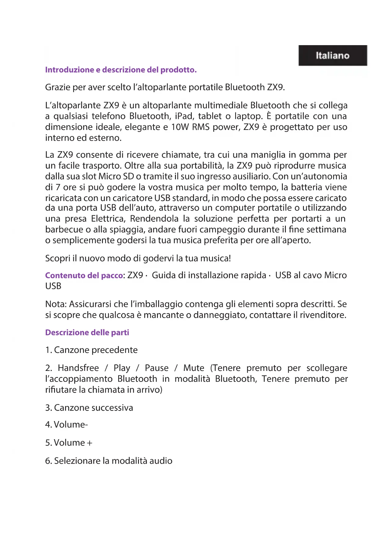 teljesen lemerülését, és időnként terhelje. Technikai támogatás. Kérjük, látogasson el honlapunkra a www.billowtechnology.com weboldalon a termék telepítésével és beállításával kapcsolatban.Introduzione e descrizione del prodotto. Grazie per aver scelto l’altoparlante portatile Bluetooth ZX9. L’altoparlante ZX9 è un altoparlante multimediale Bluetooth che si collega a qualsiasi telefono Bluetooth, iPad, tablet o laptop. È portatile con una dimensione ideale, elegante e 10W RMS power, ZX9 è progettato per uso interno ed esterno. La ZX9 consente di ricevere chiamate, tra cui una maniglia in gomma per un facile trasporto. Oltre alla sua portabilità, la ZX9 può riprodurre musica dalla sua slot Micro SD o tramite il suo ingresso ausiliario. Con un’autonomia di 7 ore si può godere la vostra musica per molto tempo, la batteria viene ricaricata con un caricatore USB standard, in modo che possa essere caricato da una porta USB dell’auto, attraverso un computer portatile o utilizzando una presa Elettrica, Rendendola la soluzione perfetta per portarti a un barbecue o alla spiaggia, andare fuori campeggio durante il ne settimana o semplicemente godersi la tua musica preferita per ore all’aperto. Scopri il nuovo modo di godervi la tua musica! Contenuto del pacco: ZX9 · Guida di installazione rapida · USB al cavo Micro USB Nota: Assicurarsi che l’imballaggio contenga gli elementi sopra descritti. Se si scopre che qualcosa è mancante o danneggiato, contattare il rivenditore. Descrizione delle parti