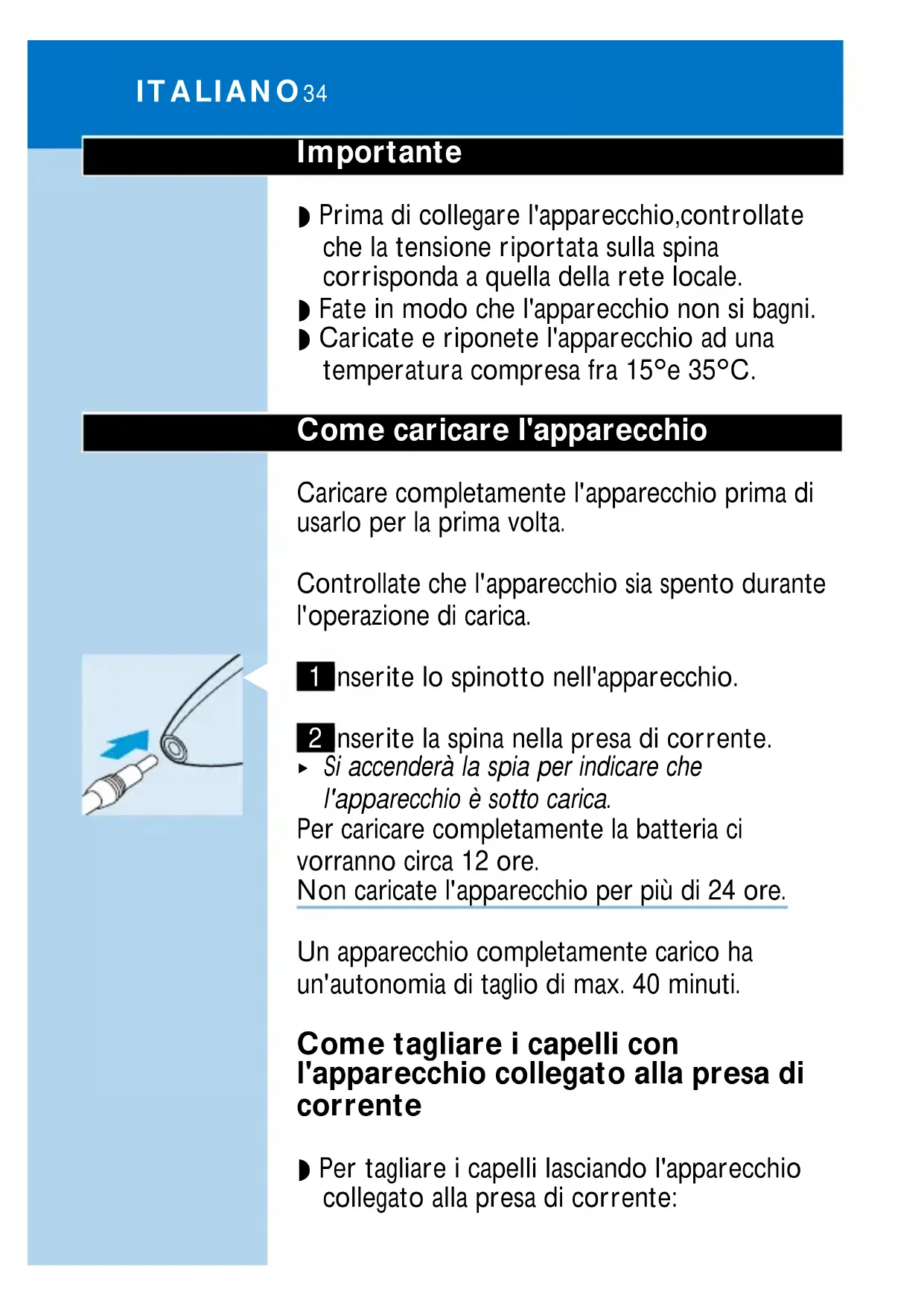 Si accenderà la spia per indicare che l'apparecchio è sotto carica. Per caricare completamente la batteria ci vorranno circa 12 ore. Non caricate l'apparecchio per più di 24 ore. Un apparecchio completamente carico ha un'autonomia di taglio di max. 40 minuti. Come tagliare i capelli con l'apparecchio collegato alla presa di corrente ◗ Per tagliare i capelli lasciando l'apparecchio collegato alla presa di corrente: ITALIANO34Spegnete il regolacapelli, collegatelo alla presa di corrente e aspettate alcuni secondi prima di accenderlo. Nel caso la batteria sia completamente scarica, aspettate alcuni minuti prima di accendere l'apparecchio. Non mettete in funzione l'apparecchio con la spina inserita quando la batteria è completamente carica. Come prepararsi per il taglio dei capelli ◗ Vedere anche l'opuscolo "Modelling and styling" Come tagliare i capelli con l'accessorio pettine 1 Selezionate il pettine piccolo o quello grande, in base alla lunghezza desiderata (vedere tabella).