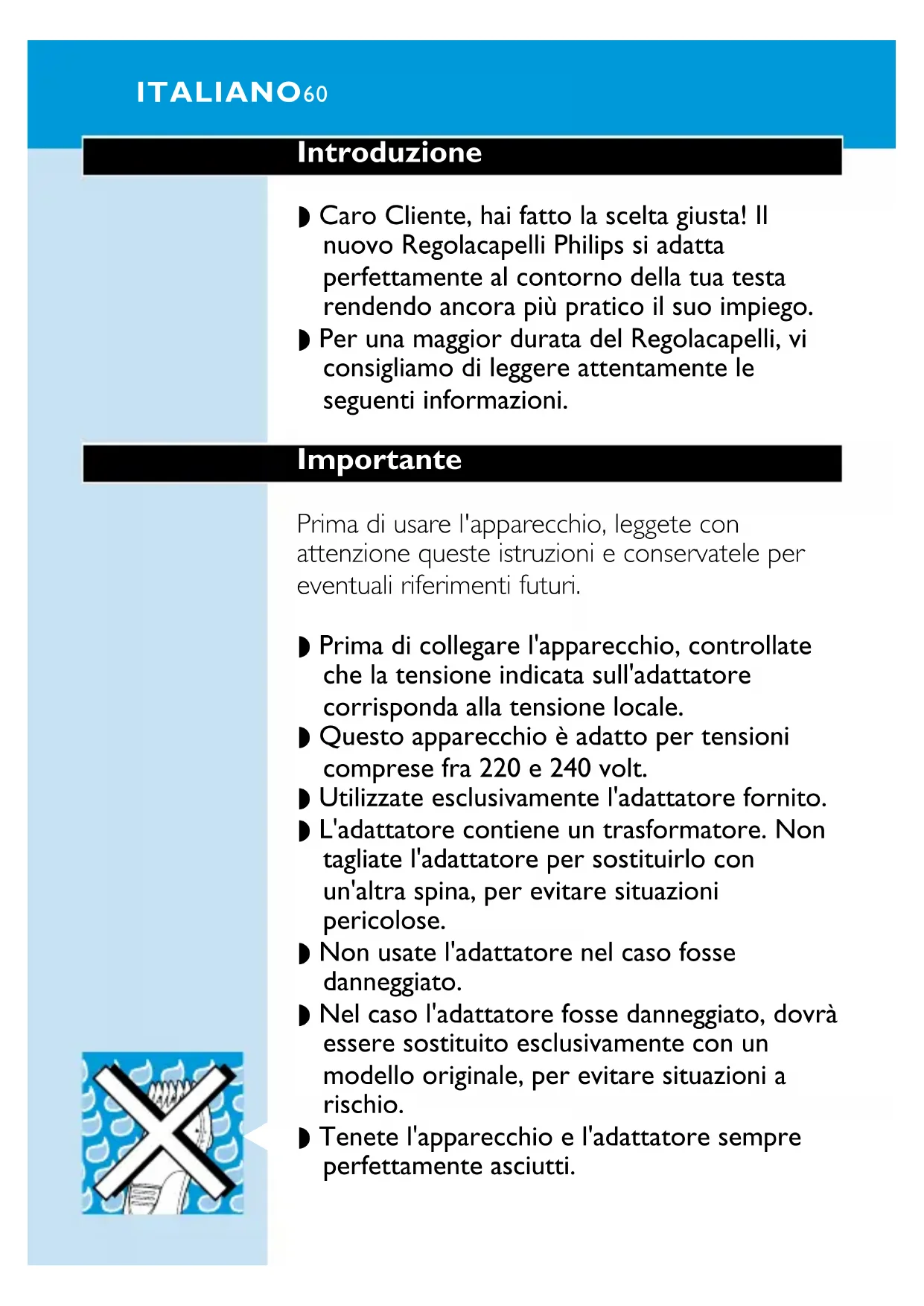 6 Saque la batería del aparato. Deshágase de la batería y de los otros componentes de un modo seguro para el medio ambiente. Una vez quitada la batería, no vuelva a enchufar el aparato a la red. Garantía y servicio Si necesita información o tiene algún problema, visite la página web de Philips en www.philips.com, o póngase en contacto con el Servicio Philips de Atención al Cliente de su país (hallará el número de teléfono en el folleto de la Garantía Mundial). Si en su país no hay Servicio Philips de Atención al Cliente, diríjase a su distribuidor local Philips o póngase en contacto con el Service Department of Philips Domestic Appliances y Personal Care BV. ESPAÑOL 59Introduzione ◗ Caro Cliente, hai fatto la scelta giusta! Il nuovo Regolacapelli Philips si adatta perfettamente al contorno della tua testa rendendo ancora più pratico il suo impiego. ◗ Per una maggior durata del Regolacapelli, vi consigliamo di leggere attentamente le seguenti informazioni. Importante Prima di usare l'apparecchio, leggete con attenzione queste istruzioni e conservatele per eventuali riferimenti futuri. ◗ Prima di collegare l'apparecchio, controllate che la tensione indicata sull'adattatore corrisponda alla tensione locale. ◗ Questo apparecchio è adatto per tensioni comprese fra 220 e 240 volt. ◗ Utilizzate esclusivamente l'adattatore fornito. ◗ L'adattatore contiene un trasformatore. Non tagliate l'adattatore per sostituirlo con un'altra spina, per evitare situazioni pericolose. ◗ Non usate l'adattatore nel caso fosse danneggiato. ◗ Nel caso l'adattatore fosse danneggiato, dovrà essere sostituito esclusivamente con un modello originale, per evitare situazioni a rischio.