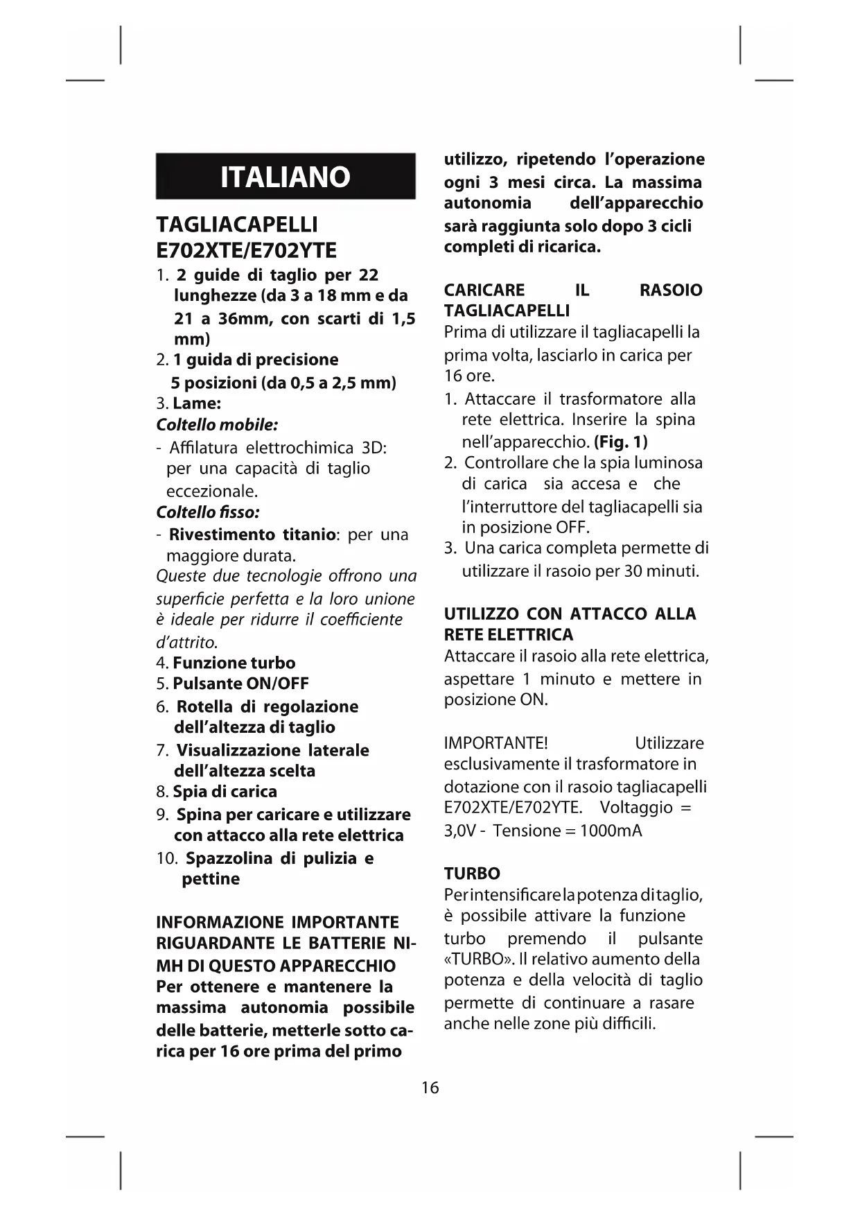 RETE ELETTRICA Attaccare il rasoio alla rete elettrica, aspettare 1 minuto e mettere in posizione ON. IMPORTANTE! Utilizzare esclusivamente il trasformatore in dotazione con il rasoio tagliacapelli E702XTE/E702YTE. Voltaggio = 3,0V - Tensione = 1000mA TURBO Per intensicare la potenza di taglio, è possibile attivare la funzione turbo premendo il pulsante «TURBO». Il relativo aumento della potenza e della velocità di taglio permette di continuare a rasare anche nelle zone più dicili.17