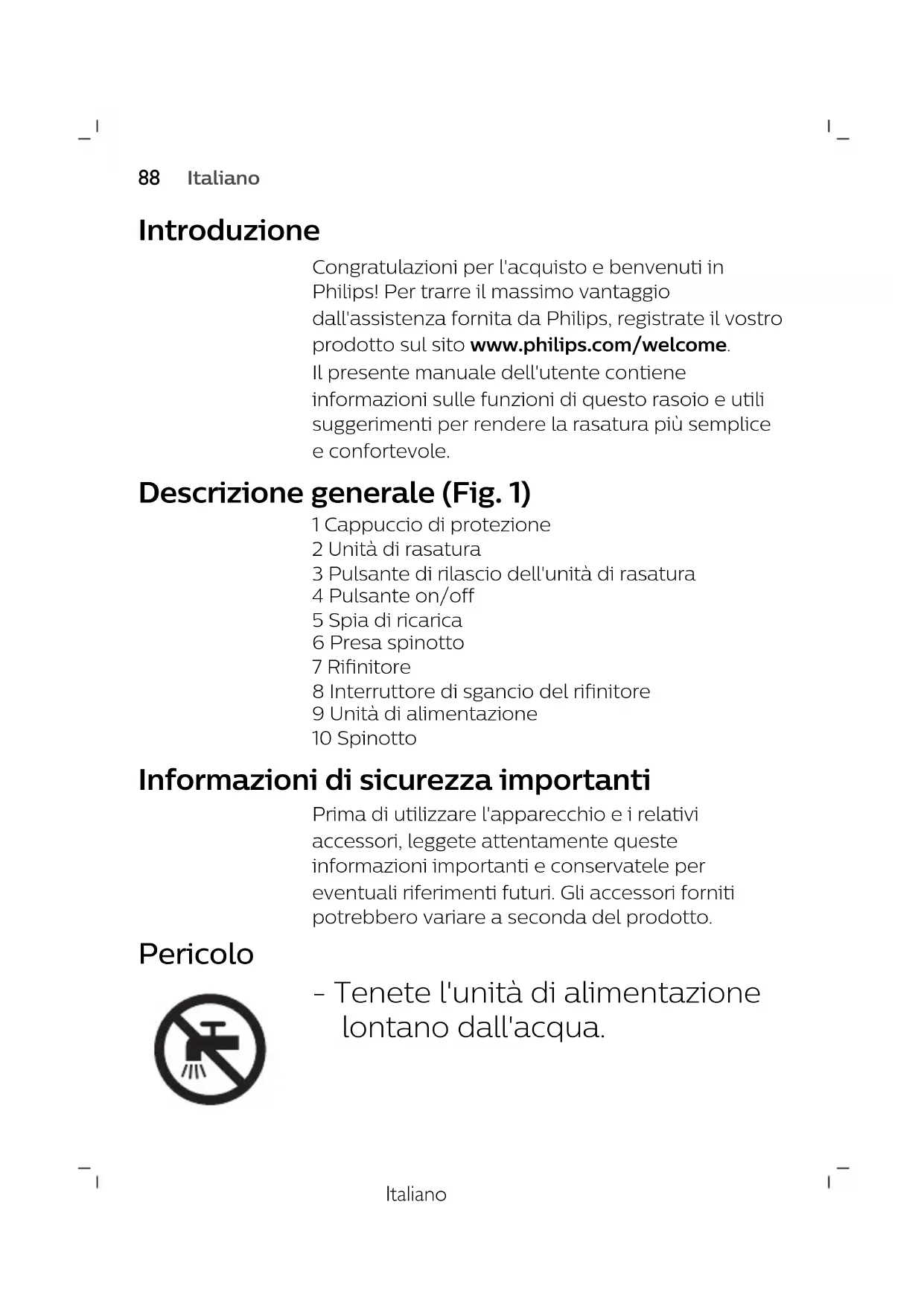FrançaisItaliano Introduzione Congratulazioni per l'acquisto e benvenuti in Philips! Per trarre il massimo vantaggio dall'assistenza fornita da Philips, registrate il vostro prodotto sul sito www.philips.com/welcome. Il presente manuale dell'utente contiene informazioni sulle funzioni di questo rasoio e utili suggerimenti per rendere la rasatura più semplice e confortevole. Descrizione generale (Fig. 1) 1 Cappuccio di protezione 2 Unità di rasatura 3 Pulsante di rilascio dell'unità di rasatura 4 Pulsante on/off 5 Spia di ricarica 6 Presa spinotto 7 Rifinitore 8 Interruttore di sgancio del rifinitore 9 Unità di alimentazione 10 Spinotto Informazioni di sicurezza importanti Prima di utilizzare l'apparecchio e i relativi accessori, leggete attentamente queste informazioni importanti e conservatele per eventuali riferimenti futuri. Gli accessori forniti potrebbero variare a seconda del prodotto. Pericolo - Tenete l'unità di alimentazione lontano dall'acqua.