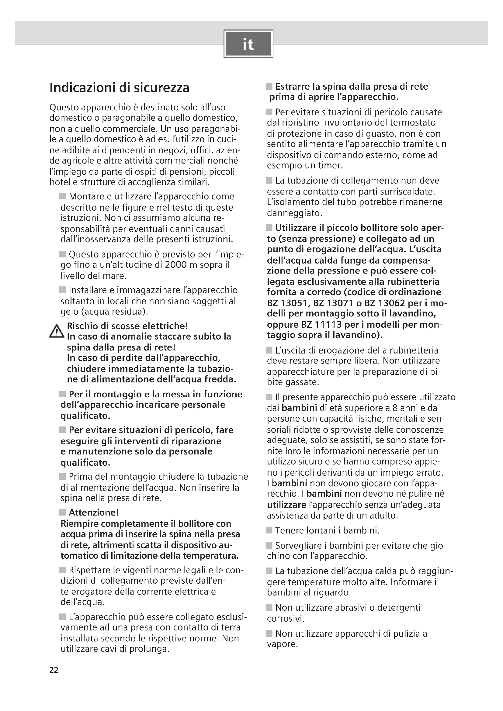 Indicazioni di sicurezza Questo apparecchio è destinato solo all’uso domestico o paragonabile a quello domestico, non a quello commerciale. Un uso paragonabi- le a quello domestico è ad es. l’utilizzo in cuci- ne adibite ai dipendenti in negozi, uffici, azien- de agricole e altre attività commerciali nonché l’impiego da parte di ospiti di pensioni, piccoli hotel e strutture di accoglienza similari. ■ Montare e utilizzare l’apparecchio come descritto nelle figure e nel testo di queste istruzioni. Non ci assumiamo alcuna re- sponsabilità per eventuali danni causati dall’inosservanza delle presenti istruzioni. ■ Questo apparecchio è previsto per l’impie- go fino a un’altitudine di 2000 m sopra il livello del mare. ■ Installare e immagazzinare l’apparecchio soltanto in locali che non siano soggetti al gelo (acqua residua). Rischio di scosse elettriche! In caso di anomalie staccare subito la spina dalla presa di rete! In caso di perdite dall’apparecchio, chiudere immediatamente la tubazio- ne di alimentazione dell’acqua fredda. ■ Per il montaggio e la messa in funzione dell’apparecchio incaricare personale qualificato. ■ Per evitare situazioni di pericolo, fare eseguire gli interventi di riparazione e manutenzione solo da personale qualificato. ■ Prima del montaggio chiudere la tubazione di alimentazione dell’acqua. Non inserire la spina nella presa di rete. ■ Attenzione! Riempire completamente il bollitore con acqua prima di inserire la spina nella presa di rete, altrimenti scatta il dispositivo au- tomatico di limitazione della temperatura. ■ Rispettare le vigenti norme legali e le con- dizioni di collegamento previste dall’en- te erogatore della corrente elettrica e dell’acqua. ■ L’apparecchio può essere collegato esclusi- vamente ad una presa con contatto di terra installata secondo le rispettive norme. Non utilizzare cavi di prolunga. ■ Estrarre la spina dalla presa di rete prima di aprire l’apparecchio. ■ Per evitare situazioni di pericolo causate dal ripristino involontario del termostato di protezione in caso di guasto, non è con- sentito alimentare l’apparecchio tramite un dispositivo di comando esterno, come ad esempio un timer. ■ La tubazione di collegamento non deve essere a contatto con parti surriscaldate. L’isolamento del tubo potrebbe rimanerne danneggiato. ■ Utilizzare il piccolo bollitore solo aper- to (senza pressione) e collegato ad un punto di erogazione dell’acqua. L’uscita dell’acqua calda funge da compensa- zione della pressione e può essere col- legata esclusivamente alla rubinetteria fornita a corredo (codice di ordinazione BZ 13051, BZ 13071 o BZ 13062 per i mo- delli per montaggio sotto il lavandino, oppure BZ 11113 per i modelli per mon- taggio sopra il lavandino). ■ L’uscita di erogazione della rubinetteria deve restare sempre libera. Non utilizzare apparecchiature per la preparazione di bi- bite gassate. ■ Il presente apparecchio può essere utilizzato dai bambini di età superiore a 8 anni e da persone con capacità fisiche, mentali e sen- soriali ridotte o sprovviste delle conoscenze adeguate, solo se assistiti, se sono state for- nite loro le informazioni necessarie per un utilizzo sicuro e se hanno compreso appie- no i pericoli derivanti da un impiego errato. I bambini non devono giocare con l’appa- recchio. I bambini non devono né pulire né utilizzare l’apparecchio senza un’adeguata assistenza da parte di un adulto. ■ Tenere lontani i bambini. ■ Sorvegliare i bambini per evitare che gio- chino con l’apparecchio. ■ La tubazione dell’acqua calda può raggiun- gere temperature molto alte. Informare i bambini al riguardo. ■ Non utilizzare abrasivi o detergenti corrosivi. ■ Non utilizzare apparecchi di pulizia a vapore.23