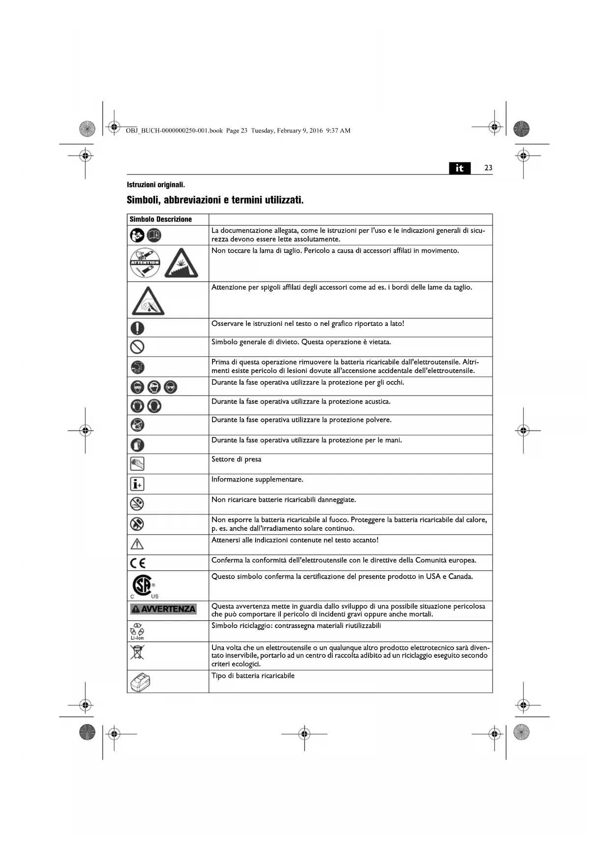 Non utilizzato il presente elettroutensile prima di aver letto e compreso accuramente e completenesse istruzioni per l'uso e le Indicazioni generali di sicurezza allegate (Numero di documentazione 341 30 054 06 1). Conservare la documentazione indica per un eventuale uso futuro ed allegarla in caso di inoltro oppure di vendita dell'elettroutensile.