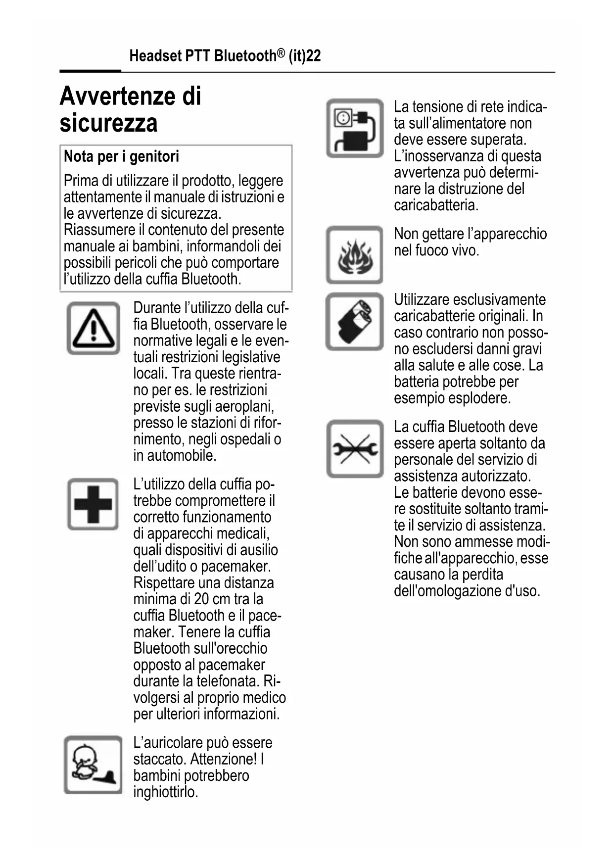Avvertenze di sicurezza Nota per i genitori Prima di utilizzare il prodotto, leggere attentamente il manuale di istruzioni e le avvertenze di sicurezza. Riassumere il contenuto del presente manuale ai bambini, informandoli dei possibili pericoli che può comportare l’utilizzo della cuffia Bluetooth. Durante l’utilizzo della cuf- fia Bluetooth, osservare le normative legali e le even- tuali restrizioni legislative locali. Tra queste rientra- no per es. le restrizioni previste sugli aeroplani, presso le stazioni di rifor- nimento, negli ospedali o in automobile. L’utilizzo della cuffia po- trebbe compromettere il corretto funzionamento di apparecchi medicali, quali dispositivi di ausilio dell’udito o pacemaker. Rispettare una distanza minima di 20 cm tra la cuffia Bluetooth e il pace- maker. Tenere la cuffia Bluetooth sull'orecchio opposto al pacemaker durante la telefonata. Ri- volgersi al proprio medico per ulteriori informazioni. L’auricolare può essere staccato. Attenzione! I bambini potrebbero inghiottirlo. La tensione di rete indica- ta sull’alimentatore non deve essere superata. L’inosservanza di questa avvertenza può determi- nare la distruzione del caricabatteria. Non gettare l’apparecchio nel fuoco vivo. Utilizzare esclusivamente caricabatterie originali. In caso contrario non posso- no escludersi danni gravi alla salute e alle cose. La batteria potrebbe per esempio esplodere. La cuffia Bluetooth deve essere aperta soltanto da personale del servizio di assistenza autorizzato. Le batterie devono esse- re sostituite soltanto trami- te il servizio di assistenza. Non sono ammesse modi- fiche all'apparecchio, esse causano la perdita dell'omologazione d'uso.23Headset PTT Bluetooth