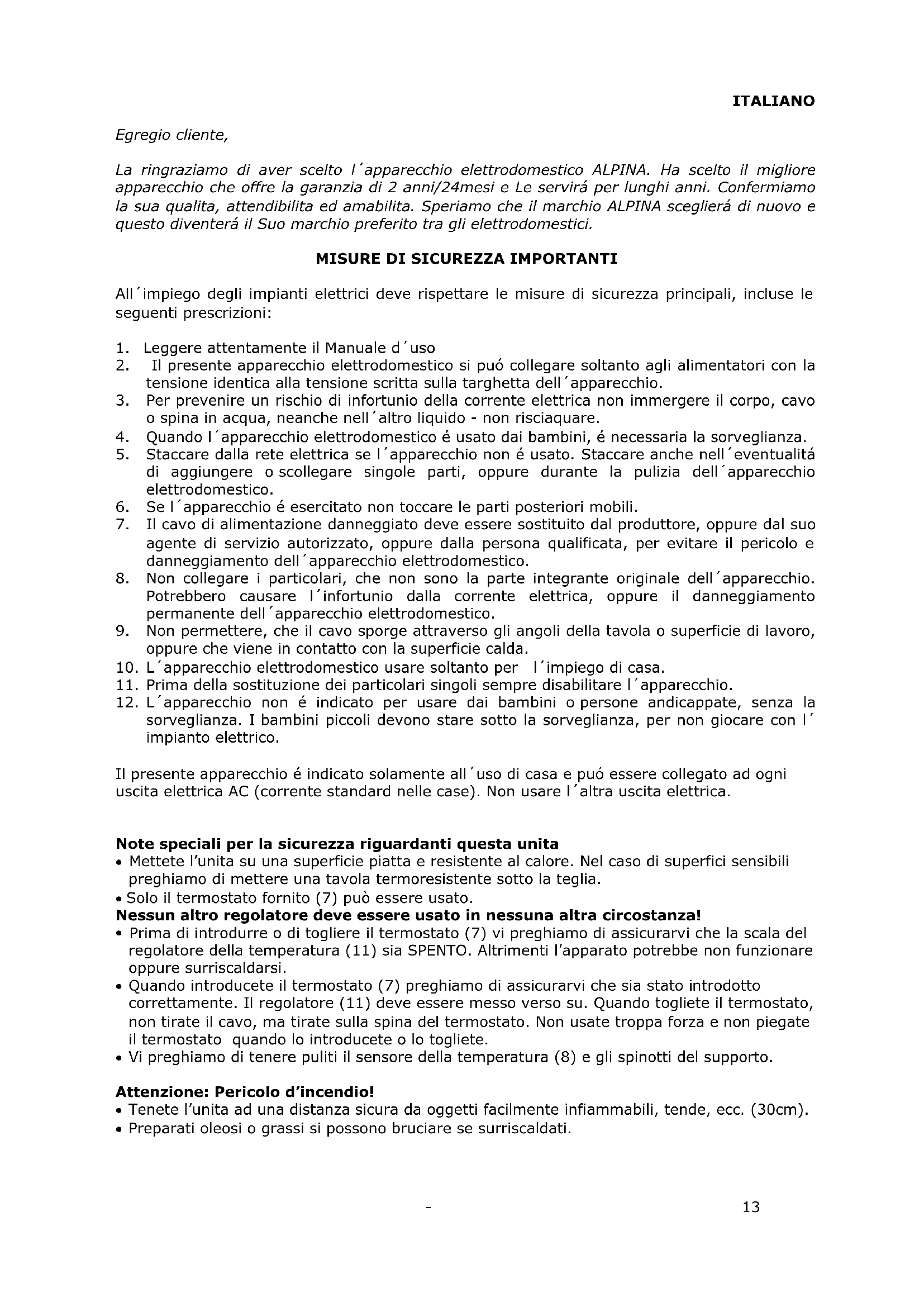 La ringraziamo di aver scelto l'apparecchio elettrodomestico ALPINA. Ha scelto il migliorere apparecchio che offre la garanzia di 2 anni/24mesi e Le servirá per lunghi anni. Confermiamo la sua qualita, attendibilità ed amabilità. Speriamo che il marchio ALPINA scegliera di nuovo e quello diventerà il Suo marchio preferito tra gli elettrodomestici.