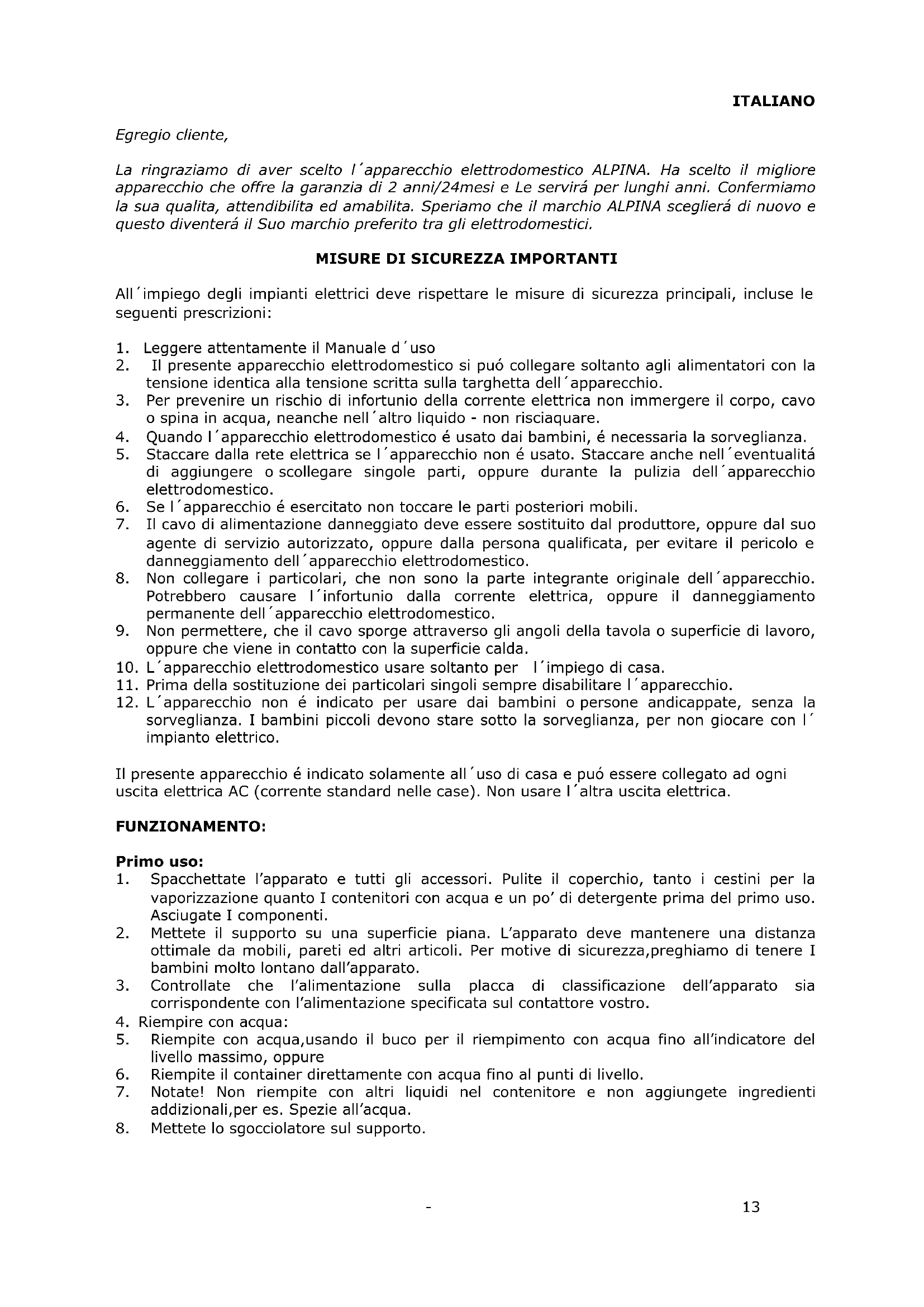 Egregio cliente, La ringraziamo di aver scelto l´apparecchio elettrodomestico ALPINA. Ha scelto il migliore apparecchio che offre la garanzia di 2 anni/24mesi e Le servirá per lunghi anni. Confermiamo la sua qualita, attendibilita ed amabilita. Speriamo che il marchio ALPINA sceglierá di nuovo e questo diventerá il Suo marchio preferito tra gli elettrodomestici.