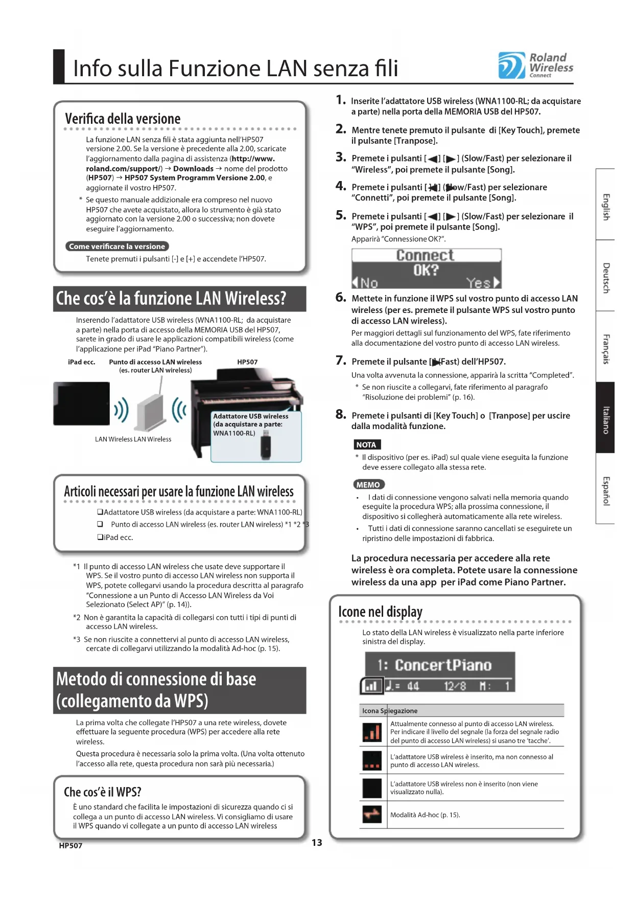 - I dati di connessione vengono salvati nella memoria quando eseguite la procedura WPS; alla prossima connessione, il dispositivo si collegherà automaticamente alla rete wireless.• Tutti i dati di connessione saranno cancellati se eseguirete un ripristino delle impostazioni di fabbrica. La procedura necessaria per accedere alla rete wireless è ora completa. Potete usare la connessione wireless da una app per iPad come Piano Partner. Icone nel display Lo stato della LAN wireless è visualizzato nella parte inferiore sinistra del display.Icona SpiegazioneAttualmente connesso al punto di accesso LAN wireless. Per indicare il livello del segnale (la forza del segnale radio del punto di accesso LAN wireless) si usano tre ‘tacche’.L’adattatore USB wireless è inserito, ma non connesso al punto di accesso LAN wireless.L’adattatore USB wireless non è inserito (non viene visualizzato nulla).Modalità Ad-hoc (p. 15).HP507Info sulla Funzione LAN senza li