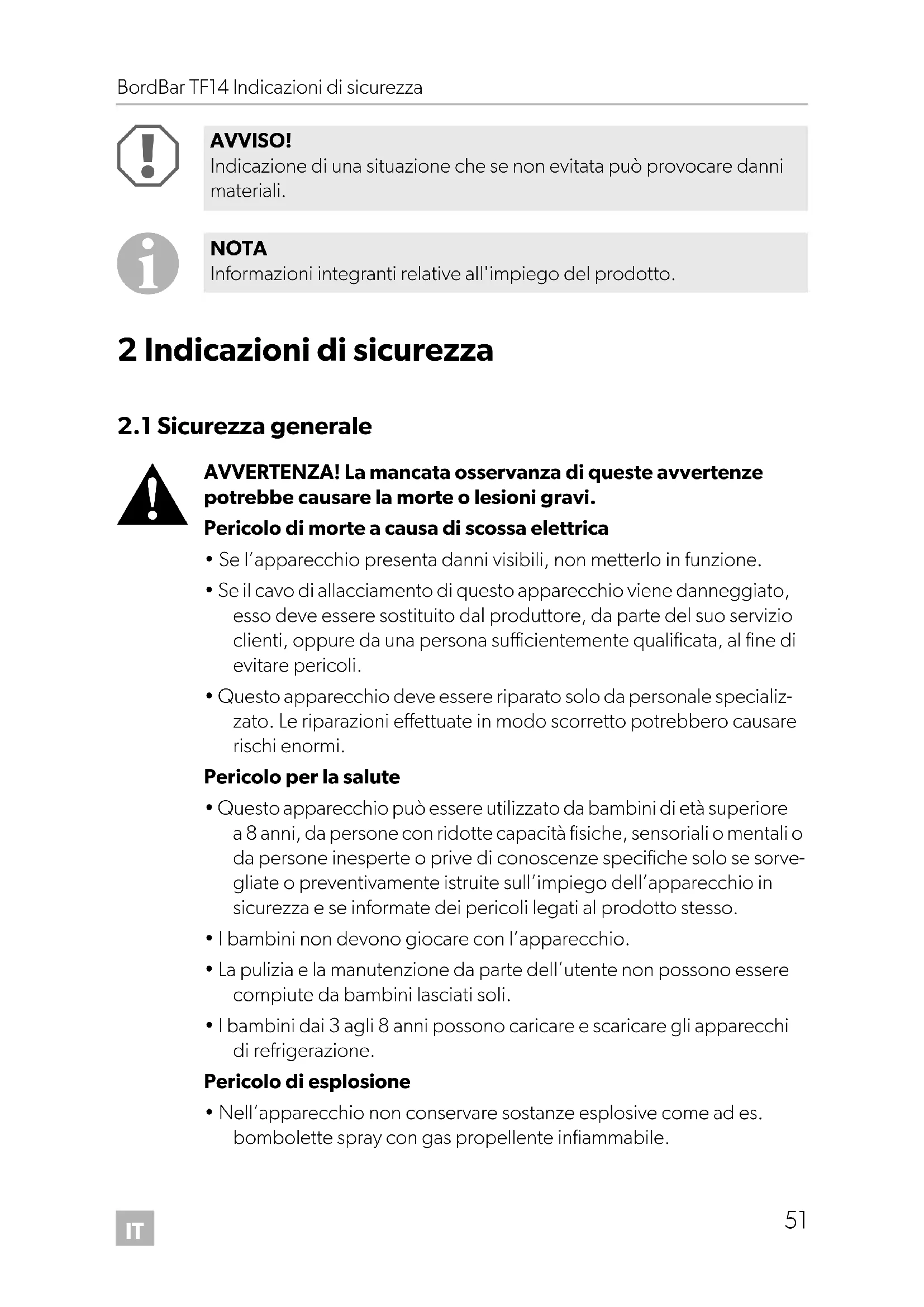 AVVERTENZA! Indicazione di sicurezza che segnala una situazione di pericolo che se non evitata può provocare morte o gravi lesioni. ATTENZIONE! Indicazione di sicurezza che segnala una situazione di pericolo che se non evitata può provocare lesioni lievi o di gravità media. TF14_OPM_EMEA16.book Seite 50 Donnerstag, 27. Juni 2019 4:38 16IT BordBar TF14 Indicazioni di sicurezza