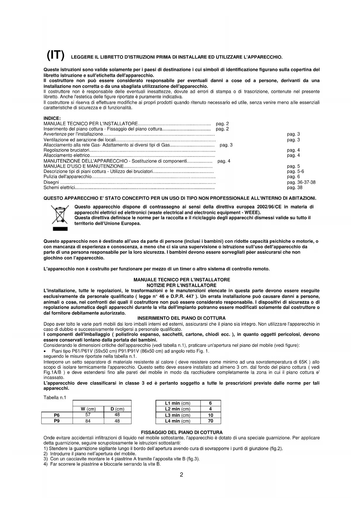 seite. 21 FÜR EINBAUKOCHFLÄCHEN MIT GASBETRIEB UND GEMISCHTEM BETRIEB 59X50 cm (TYP P61/P61V) 86X50 cm (TYP P91/P91V) (NL) INSTRUCTIES VOOR DE INSTALLATIE, HET ONDERHOUD EN pag. 26 HET GEBRUIK VAN GAS- EN GEMENGDE INBOUWKOOKVLAKKEN 59X50 cm (MODEL P61/P61V) 86X50 cm (MODEL P91/P91V) (BE) HANDBOEKJE MET INSTRUCTIES VOOR DE INSTALLATIE, pag. 31 HET ONDERHOUD EN HET GEBRUIK VAN GAS- EN GEMENGDE INBOUWKOOKVLAKKEN 59X50 cm (MODEL P61/P61V) 86x50 cm (MODEL P91/P91V)2 (IT) LEGGERE IL LIBRETTO D'ISTRUZIONI PRIMA DI INSTALLARE ED UTILIZZARE L'APPARECCHIO. Queste istruzioni sono valide solamente per i paesi di destinazione i cui simboli di identificazione figurano sulla copertina del libretto istruzione e sull'etichetta dell'apparecchio. Il costruttore non può essere considerato responsabile per eventuali danni a cose od a persone, derivanti da una installazione non corretta o da una sbagliata utilizzazione dell'apparecchio. Il costruttore non è responsabile delle eventuali inesattezze, dovute ad errori di stampa o di trascrizione, contenute nel presente libretto. Anche l'estetica delle figure riportate è puramente indicativa. Il costruttore si riserva di effettuare modifiche ai propri prodotti quando ritenuto necessario ed utile, senza venire meno alle essenziali caratteristiche di sicurezza e di funzionalità. INDICE: MANUALE TECNICO PER L'INSTALLATORE......................................................... pag. 2 Inserimento del piano cottura - Fissaggio del piano cottura...................................... pag. 2 Avvertenze per l'installazione...................................................................................... pag. 3 Ventilazione ed aerazione dei locali............................................................................. pag. 3 Allacciamento alla rete Gas- Adattamento ai diversi tipi di Gas................................... pag. 3 Regolazione bruciatori................................................................................................. pag. 4 Allacciamento elettrico................................................................................................ pag. 4 MANUTENZIONE DELL'APPARECCHIO - Sostituzione di componenti.................... pag. 4 MANUALE D'USO E MANUTENZIONE.................................................................... pag. 5 Descrizione tipi di piani cottura - Utilizzo dei bruciatori............................................... pag. 5-6 Pulizia dell'apparecchio............................................................................................... pag. 6 Disegni ....................................................................................................................... pag. 36-37-38 Schemi elettrici........................................................................................................... pag. 38 QUESTO APPARECCHIO E' STATO CONCEPITO PER UN USO DI TIPO NON PROFESSIONALE ALL'INTERNO DI ABITAZIONI. Questo apparecchio dispone di contrassegno ai sensi della direttiva europea 2002/96/CE in materia di apparecchi elettrici ed elettronici (waste electrical and electronic equipment - WEEE). Questa direttiva definisce le norme per la raccolta e il riciclaggio degli apparecchi dismessi valide su tutto il territorio dell’Unione Europea.