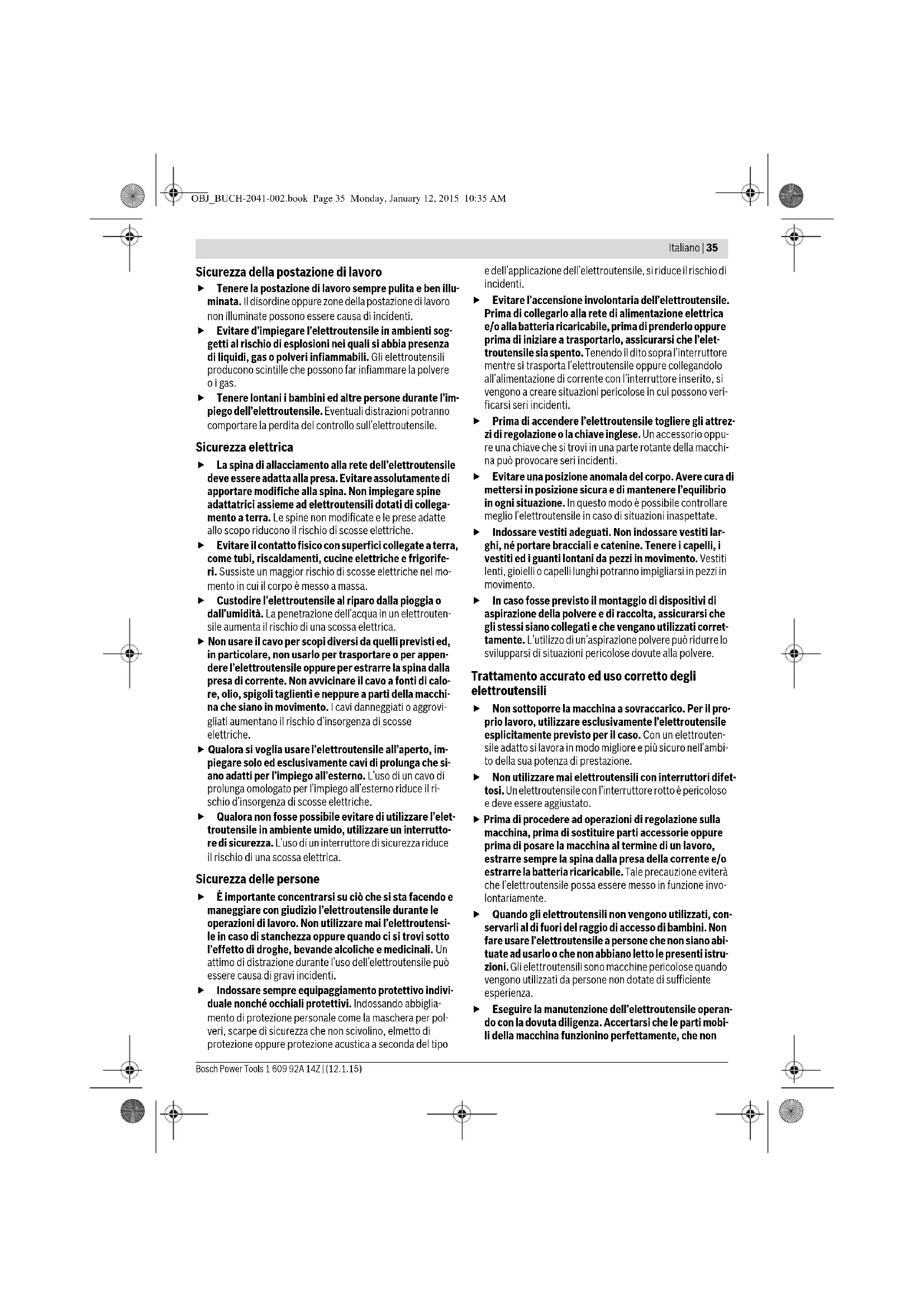 Montar/desmontar clipe de cor 12 209 Montar/desmontar o porta-bits 13 209 Selecção mecânica de marcha 14 209 Meta de ação Figura Observe Página OBJ_BUCH-2041-002.book Page 33 Monday, January 12, 2015 10:35 AM34 | Italiano 1 609 92A 14Z | (12.1.15) Bosch Power Tools Manutenção e limpeza Manter a ferramenta eléctrica e as aberturas de venti- lação sempre limpas, para trabalhar bem e de forma se- gura. Após cada utilização, deverá limpar a ferramenta de trabalho, a fixação da ferramenta e as aberturas de ventilação da ferra- menta eléctrica, assim como as aberturas de ventilação do acumulador. Serviço pós-venda e consultoria de aplicação O serviço pós-venda responde às suas perguntas a respeito de serviços de reparação e de manutenção do seu produto, assim como das peças sobressalentes. Desenhos explodidos e informações sobre peças sobressalentes encontram-se em: www.bosch-pt.com A nossa equipa de consultoria de aplicação Bosch esclarecem com prazer todas as suas dúvidas a respeito da compra, apli- cação e ajuste dos produtos e acessórios. Para todas as questões e encomendas de peças sobressalen- tas é imprescindível indicar o número de produto de 10 dígitos como consta na placa de características da ferra- menta eléctrica. Portugal Robert Bosch LDA Avenida Infante D. Henrique Lotes 2E – 3E 1800 Lisboa Para efectuar o seu pedido online de peças entre na página www.ferramentasbosch.com. Tel.: 21 8500000 Fax: 21 8511096 Brasil Robert Bosch Ltda. Caixa postal 1195 13065-900 Campinas Tel.: (0800) 7045446 www.bosch.com.br/contacto Transporte Os acumuladores de iões de lítio, contidos, estão sujeitos ao direito de materiais perigosos. Os acumuladores podem ser transportados na rua pelo utilizador, sem mais obrigações. Na expedição por terceiros (por ex.: transporte aéreo ou ex- pedição), devem ser observadas as especiais exigências quanto à embalagem e à designação. Neste caso é necessário consultar um especialista de materiais perigosos ao preparar a peça a ser trabalhada. Só enviar acumuladores se a carcaça não estiver danificada. Colar contactos abertos e embalar o acumulador de modo que não possa se movimentar dentro da embalagem. Por favor observe também eventuais directivas nacionais su- plementares. Eliminação As ferramentas eléctricas, os acessórios e as embala- gens devem ser enviados a uma reciclagem ecológica de matéria prima. Não deitar ferramentas eléctricas e acumuladores/pilhas no lixo doméstico! Apenas países da União Europeia: Conforme as Directivas Europeias 2012/19/UE relativa aos resíduos de ferra- mentas eléctricas europeias 2006/66/CE é necessário recolher separadamente os acu- muladores/as pilhas defeituosos ou gastos e conduzí-los a uma reciclagem ecológica. Sob reserva de alterações. Italiano Avvertenze generali di pericolo per elettroutensili Leggere tutte le avvertenze di pe- ricolo e le istruzioni operative. In caso di mancato rispetto delle avvertenze di pericolo e delle istruzioni operative si potrà creare il pericolo di scosse elettri- che, incendi e/o incidenti gravi. Conservare tutte le avvertenze di pericolo e le istruzioni operative per ogni esigenza futura. Il termine «elettroutensile» utilizzato nelle avvertenze di peri- colo si riferisce ad utensili elettrici alimentati dalla rete (con li- nea di allacciamento) ed ad utensili elettrici alimentati a bat- teria (senza linea di allacciamento). Ligar e desligar 15 210 Controlar o estado de carga do acumulador 16 210 Seleccionar acessórios – 211 – 212 Meta de ação Figura Observe Página AVVERTENZA OBJ_BUCH-2041-002.book Page 34 Monday, January 12, 2015 10:35 AMItaliano | 35 Bosch Power Tools 1 609 92A 14Z | (12.1.15) Sicurezza della postazione di lavoro Tenere la postazione di lavoro sempre pulita e ben illu- minata. Il disordine oppure zone della postazione di lavoro non illuminate possono essere causa di incidenti. Evitare d’impiegare l’elettroutensile in ambienti sog- getti al rischio di esplosioni nei quali si abbia presenza di liquidi, gas o polveri infiammabili. Gli elettroutensili producono scintille che possono far infiammare la polvere o i gas. Tenere lontani i bambini ed altre persone durante l’im- piego dell’elettroutensile. Eventuali distrazioni potranno comportare la perdita del controllo sull’elettroutensile. Sicurezza elettrica La spina di allacciamento alla rete dell’elettroutensile deve essere adatta alla presa. Evitare assolutamente di apportare modifiche alla spina. Non impiegare spine adattatrici assieme ad elettroutensili dotati di collega- mento a terra. Le spine non modificate e le prese adatte allo scopo riducono il rischio di scosse elettriche. Evitare il contatto fisico con superfici collegate a terra, come tubi, riscaldamenti, cucine elettriche e frigorife- ri. Sussiste un maggior rischio di scosse elettriche nel mo- mento in cui il corpo è messo a massa. Custodire l’elettroutensile al riparo dalla pioggia o dall’umidità. La penetrazione dell’acqua in un elettrouten- sile aumenta il rischio di una scossa elettrica. Non usare il cavo per scopi diversi da quelli previsti ed, in particolare, non usarlo per trasportare o per appen- dere l’elettroutensile oppure per estrarre la spina dalla presa di corrente. Non avvicinare il cavo a fonti di calo- re, olio, spigoli taglienti e neppure a parti della macchi- na che siano in movimento. I cavi danneggiati o aggrovi- gliati aumentano il rischio d’insorgenza di scosse elettriche. Qualora si voglia usare l’elettroutensile all’aperto, im- piegare solo ed esclusivamente cavi di prolunga che si- ano adatti per l’impiego all’esterno. L’uso di un cavo di prolunga omologato per l’impiego all’esterno riduce il ri- schio d’insorgenza di scosse elettriche. Qualora non fosse possibile evitare di utilizzare l’elet- troutensile in ambiente umido, utilizzare un interrutto- re di sicurezza. L’uso di un interruttor