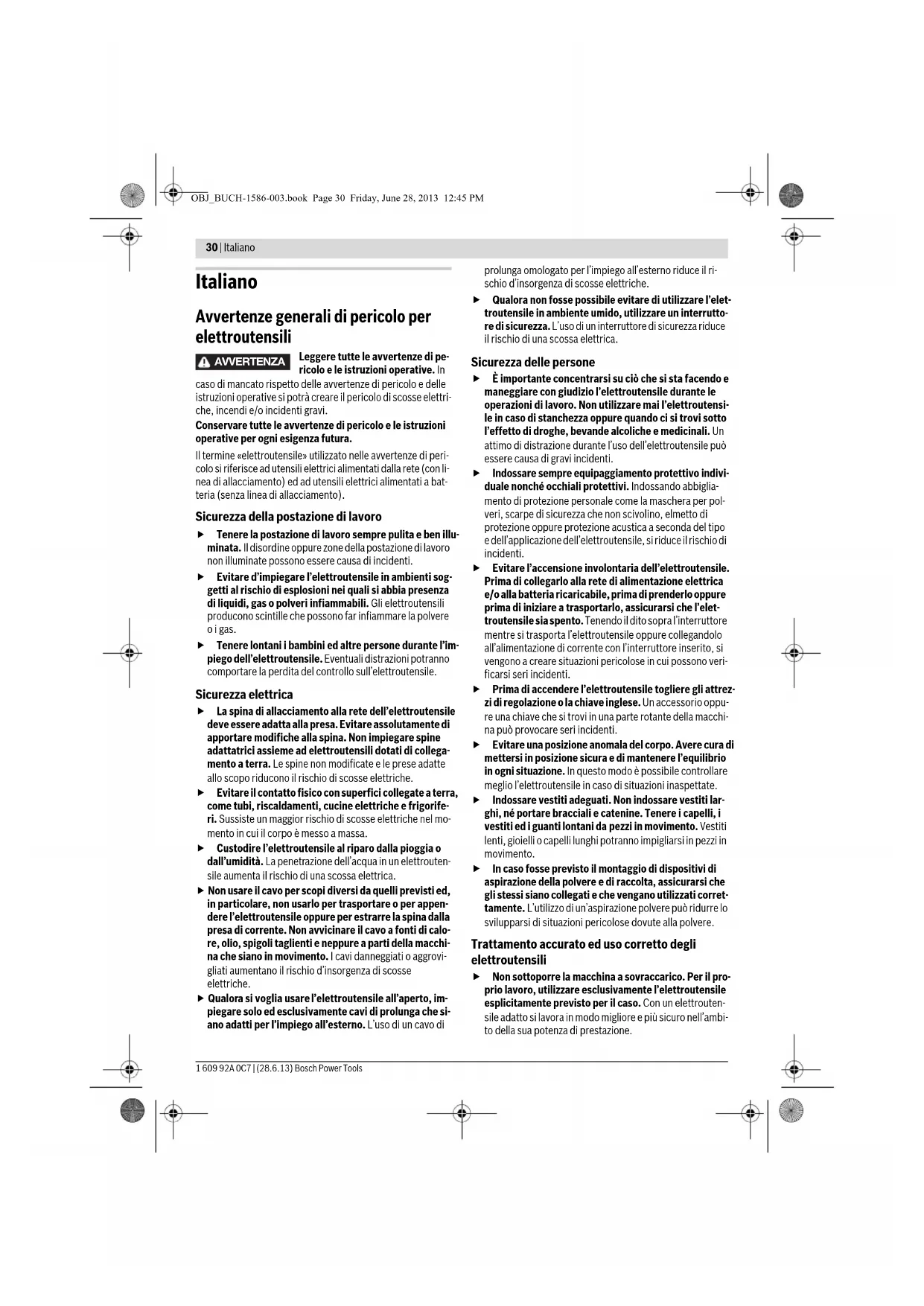 Informação sobre ruídos/vibrações Os valores de medição do produto encontram-se na tabela da página 155. Valores totais de vibração e ruído (soma dos vectores das três direcções) apurados conforme EN 60745. O nível de oscilações indicado nestas instruções de serviço foi medido de acordo com um processo de medição normali- zado pela norma EN 60745 e pode ser utilizado para a com- paração de aparelhos. Ele também é apropriado para uma avaliação provisória da carga de vibrações. O nível de vibrações indicado representa as aplicações princi- pais da ferramenta eléctrica. Se a ferramenta eléctrica for uti- lizada para outras aplicações, com outras ferramentas de tra- balho ou com manutenção insuficiente, é possível que o nível de vibrações seja diferente. Isto pode aumentar sensivelmen- te a carga de vibrações para o período completo de trabalho. Para uma estimação exacta da carga de vibrações, também deveriam ser considerados os períodos nos quais o aparelho está desligado ou funciona, mas não está sendo utilizado. Isto pode reduzir a carga de vibrações durante o completo perío- do de trabalho. Além disso também deverão ser estipuladas medidas de se- gurança para proteger o operador contra o efeito de vibra- ções, como por exemplo: Manutenção de ferramentas eléctri- cas e de ferramentas de trabalho, manter as mãos quentes e organização dos processos de trabalho. Montagem de funcionamento A seguinte tabela indica os objectivos de acção para a montagem e a operação da ferramenta eléctrica. As instruções dos objec- tivos de acção são mostradas na figura indicada. Dependendo do tipo da aplicação, são necessárias diferentes combinações de instruções. Devem ser observadas as instruções de segurança. Henk Becker Executive Vice President Engineering Helmut Heinzelmann Head of Product Certification PT/ETM9 Meta de acção Figura Observe Página Retirar o acumulador 1 156 Colocar o acumulador 2 156 Montar a ferramenta de trabalho 3 156 Ajustar o sentido de rotação 4 157 Pré-seleccionar o binário 5 157 Seleccionar a posição de perfuração 6 158 OBJ_BUCH-1586-003.book Page 28 Friday, June 28, 2013 12:45 PMPortuguês | 29 Bosch Power Tools 1 609 92A 0C7 | (28.6.13) Manutenção e limpeza Manter a ferramenta eléctrica e as aberturas de venti- lação sempre limpas, para trabalhar bem e de forma se- gura. Após cada utilização, deverá limpar a ferramenta de trabalho, a fixação da ferramenta e as aberturas de ventilação da ferra- menta eléctrica, assim como as aberturas de ventilação do acumulador. Serviço pós-venda e consultoria de aplicação O serviço pós-venda responde às suas perguntas a respeito de serviços de reparação e de manutenção do seu produto, assim como das peças sobressalentes. Desenhos explodidos e informações sobre peças sobressalentes encontram-se em: www.bosch-pt.com A nossa equipa de consultoria de aplicação Bosch esclarecem com prazer todas as suas dúvidas a respeito da compra, apli- cação e ajuste dos produtos e acessórios. Para todas as questões e encomendas de peças sobressalen- tas é imprescindível indicar o número de produto de 10 dígitos como consta na placa de características da ferra- menta eléctrica. Portugal Robert Bosch LDA Avenida Infante D. Henrique Lotes 2E – 3E 1800 Lisboa Tel.: 21 8500000 Fax: 21 8511096 Brasil Robert Bosch Ltda. Caixa postal 1195 13065-900 Campinas Tel.: (0800) 7045446 www.bosch.com.br/contacto Transporte Os acumuladores de iões de lítio, contidos, estão sujeitos ao direito de materiais perigosos. Os acumuladores podem ser transportados na rua pelo utilizador, sem mais obrigações. Na expedição por terceiros (por ex.: transporte aéreo ou ex- pedição), devem ser observadas as especiais exigências quanto à embalagem e à designação. Neste caso é necessário consultar um especialista de materiais perigosos ao preparar a peça a ser trabalhada. Só enviar acumuladores se a carcaça não estiver danificada. Colar contactos abertos e embalar o acumulador de modo que não possa se movimentar dentro da embalagem. Por favor observe também eventuais directivas nacionais su- plementares. Eliminação As ferramentas eléctricas, os acessórios e as embala- gens devem ser enviados a uma reciclagem ecológica de matéria prima. Não deitar ferramentas eléctricas e acumuladores/pilhas no lixo doméstico! Apenas países da União Europeia: Conforme as Directivas Europeias 2012/19/UE relativa aos resíduos de ferra- mentas eléctricas europeias 2006/66/CE é necessário recolher separadamente os acu- muladores/as pilhas defeituosos ou gastos e conduzí-los a uma reciclagem ecológica. Sob reserva de alterações. Selecção mecânica de marcha 7 158 Ligar e desligar 8 158 Seleccionar acessórios – 159 Meta de acção Figura Observe Página OBJ_BUCH-1586-003.book Page 29 Friday, June 28, 2013 12:45 PM30 | Italiano 1 609 92A 0C7 | (28.6.13) Bosch Power Tools Italiano Avvertenze generali di pericolo per elettroutensili Leggere tutte le avvertenze di pe- ricolo e le istruzioni operative. In caso di mancato rispetto delle avvertenze di pericolo e delle istruzioni operative si potrà creare il pericolo di scosse elettri- che, incendi e/o incidenti gravi. Conservare tutte le avvertenze di pericolo e le istruzioni operative per ogni esigenza futura. Il termine «elettroutensile» utilizzato nelle avvertenze di peri- colo si riferisce ad utensili elettrici alimentati dalla rete (con li- nea di allacciamento) ed ad utensili elettrici alimentati a bat- teria (senza linea di allacciamento). Sicurezza della postazione di lavoro Tenere la postazione di lavoro sempre pulita e ben illu- minata. Il disordine oppure zone della postazione di lavoro non illuminate possono essere causa di incidenti. Evitare d’impiegare l’elettroutensile in ambienti sog- getti al rischio di esplosioni nei quali si abbia presenza di liquidi, gas 
