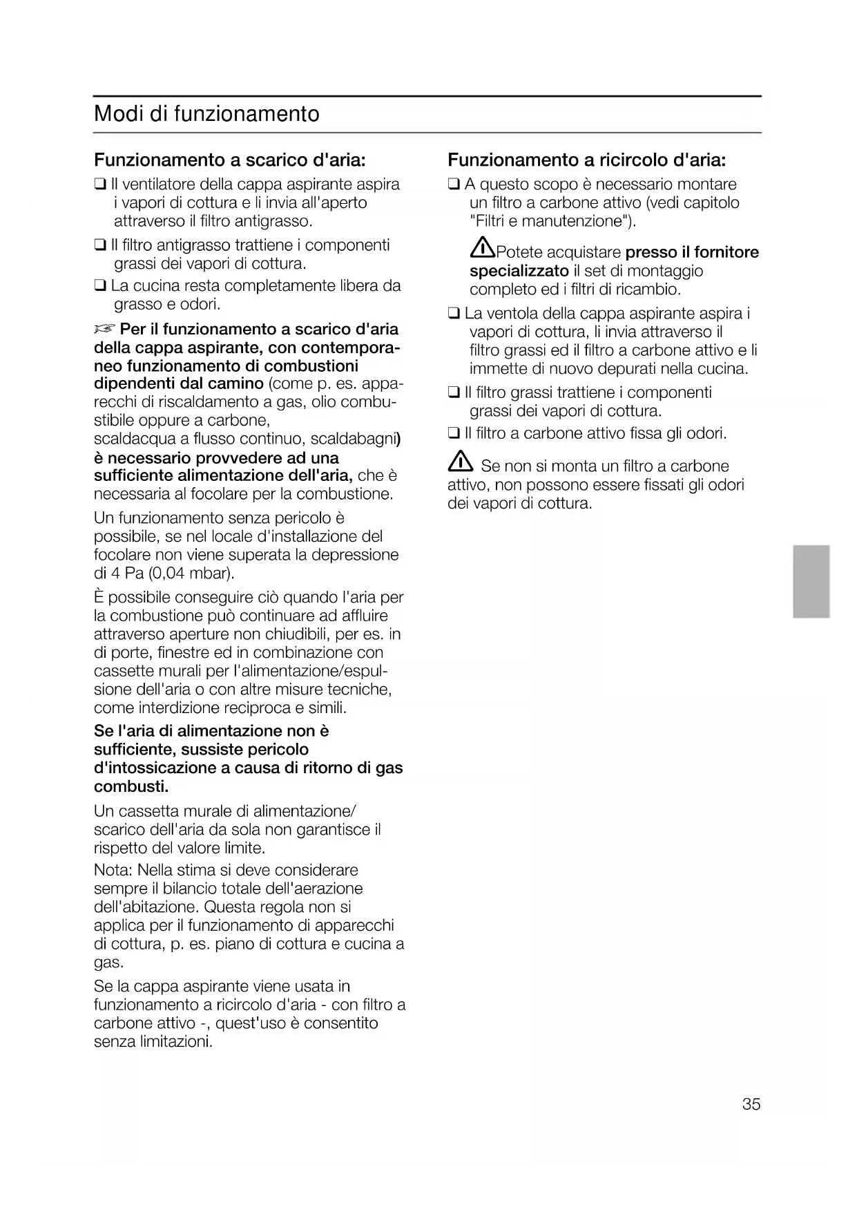 Per il funzionamento a scarico d'aria della cappa aspirante, con contempora- neo funzionamento di combustioni dipendenti dal camino (come p. es. appa- recchi di riscaldamento a gas, olio combu- stibile oppure a carbone, scaldacqua a flusso continuo, scaldabagni) è necessario provvedere ad una sufficiente alimentazione dell'aria, che è necessaria al focolare per la combustione. Un funzionamento senza pericolo è possibile, se nel locale d'installazione del focolare non viene superata la depressione di 4 Pa (0,04 mbar). È possibile conseguire ciò quando l'aria per la combustione può continuare ad affluire attraverso aperture non chiudibili, per es. in di porte, finestre ed in combinazione con cassette murali per l'alimentazione/espul- sione dell'aria o con altre misure tecniche, come interdizione reciproca e simili. Se l'aria di alimentazione non è sufficiente, sussiste pericolo d'intossicazione a causa di ritorno di gas combusti. Un cassetta murale di alimentazione/ scarico dell'aria da sola non garantisce il rispetto del valore limite. Nota: Nella stima si deve considerare sempre il bilancio totale dell'aerazione dell'abitazione. Questa regola non si applica per il funzionamento di apparecchi di cottura, p. es. piano di cottura e cucina a gas. Se la cappa aspirante viene usata in funzionamento a ricircolo d'aria - con filtro a carbone attivo -, quest'uso è consentito senza limitazioni. Modi di funzionamento Funzionamento a ricircolo d'aria: ❑ A questo scopo è necessario montare un filtro a carbone attivo (vedi capitolo "Filtri e manutenzione"). Potete acquistare presso il fornitore specializzato il set di montaggio completo ed i filtri di ricambio. ❑ La ventola della cappa aspirante aspira i vapori di cottura, li invia attraverso il filtro grassi ed il filtro a carbone attivo e li immette di nuovo depurati nella cucina. ❑ Il filtro grassi trattiene i componenti grassi dei vapori di cottura. ❑ Il filtro a carbone attivo fissa gli odori. Se non si monta un filtro a carbone attivo, non possono essere fissati gli odori dei vapori di cottura.36 Precede la prima utilizzazione Primo impiego: ❑ Questo libretto di istruzioni per l'uso èprevisto per più versioni dell' apparecchio. É possibile che siano descritti singoli particolari della dotazio- ne, che non riguardano il Vostro appa- recchio. ❑ Questa cappa aspirante è conforme alle pertinenti norme di sicurezza. Le riparazioni devono essere eseguite solo da personale specializzato. Le riparazioni non eseguite a regola d'arte possono causare pericoli gravi per l'utilizzatore. Piani di cottura a gas / Fornelli a gas Non usare tutti i fornelli contemporaneamente al massimo carico termico per un periodo prolungato (max. 15 minuti), altrimenti sussiste il pericolo di scottature, se si tocca la superficie dell’involucro o pericolo di danni alla cappa aspirante. Nell’uso della cappa aspirante sopra un piano di cottura a gas, in caso d’utilizzazione contemporanea di tre o più fornelli a gas, la cappa aspirante deve funzionare alla massima potenza d’aspirazione. ❑ Prima di usare il nuovo apparecchio, leg- gete attentamente le istruzioni per l'uso. Esse contengono informazioni importanti per la Vostra sicurezza, e anche per l'uso e la manutenzione dell'apparecchio. ❑ Conservate bene il libretto delle istruzioni per l'uso e il montaggio, per un eventuale successivo proprietario. ❑ Questo apparecchio dis- pone di contrassegno ai sensi della direttiva europea 2002/96/CE in materia di apparecchi elettrici ed elettronici (waste electrical and electronic equipment – WEEE). Questa direttiva definisce le norme per la raccolta e il riciclaggio degli apparecchi dismessi valide su tutto il territorio dell’Unione Europea.