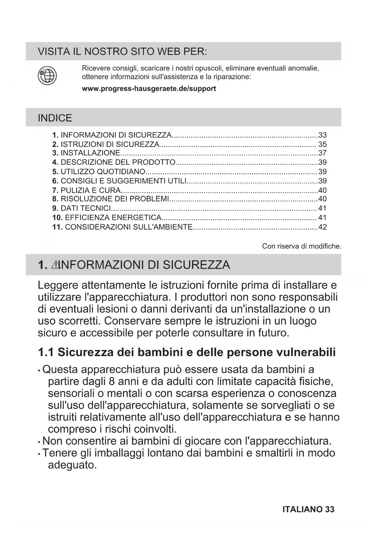 Riciclare i materiali con il simbolo . Buttare l'imballaggio negli appositi contenitori per il riciclaggio. Aiutare a proteggere l’ambiente e la salute umana e a riciclare rifiuti derivanti da apparecchiature elettriche ed elettroniche. Non smaltire le apparecchiature che riportano il simbolo insieme ai normali rifiuti domestici. Portare il prodotto al punto di riciclaggio più vicino o contattare il comune di residenza. 42 ITALIANO *43www.progress-hausgeraete.de 867366583-B-332022
