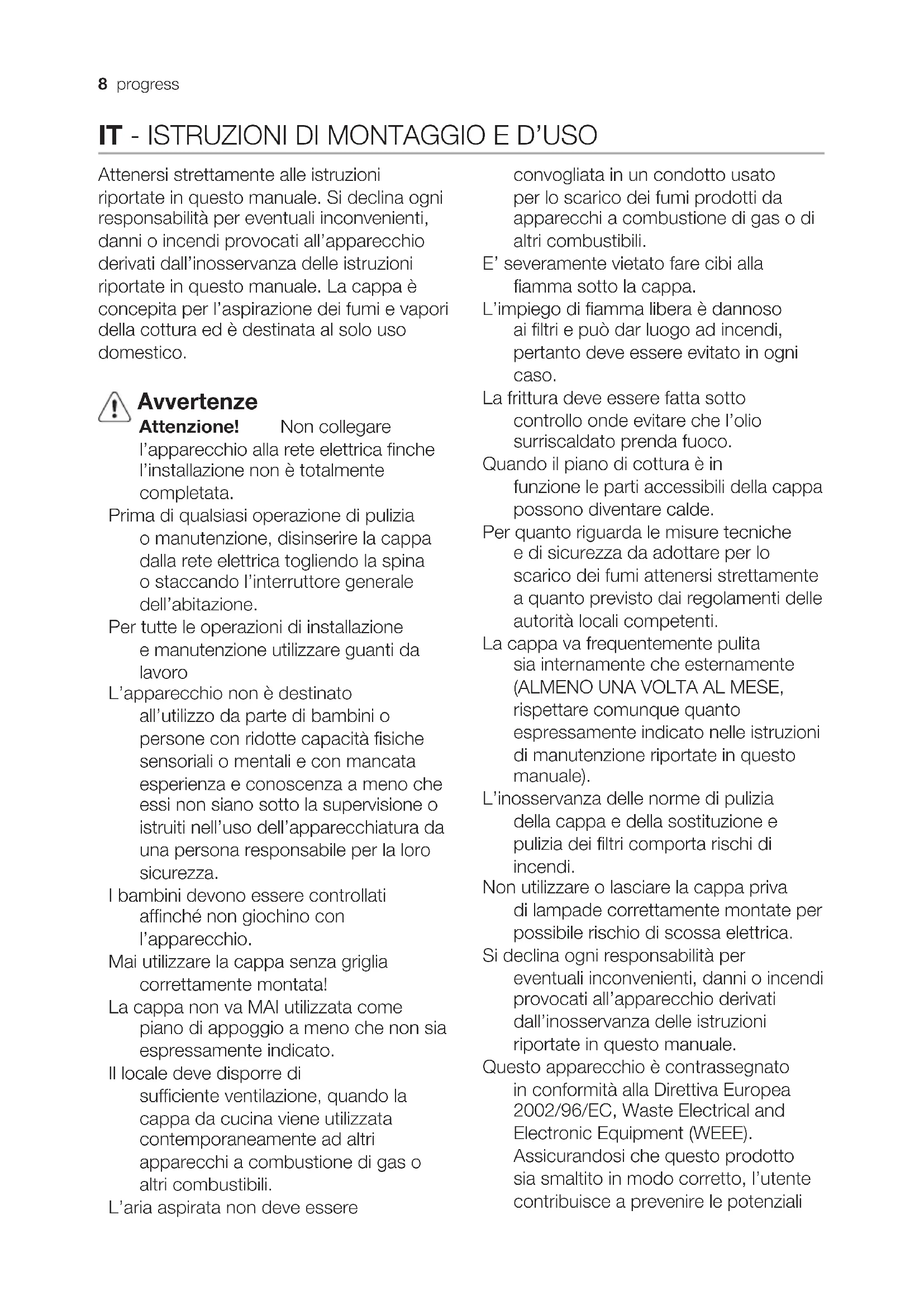 16.1-Type 208 progress IT - ISTRUZIONI DI MONTAGGIO E D’USO Attenersi strettamente alle istruzioni riportate in questo manuale. Si declina ogni responsabilità per eventuali inconvenienti, danni o incendi provocati all’apparecchio derivati dall’inosservanza delle istruzioni riportate in questo manuale. La cappa è concepita per l’aspirazione dei fumi e vapori della cottura ed è destinata al solo uso domestico. Avvertenze Attenzione! Non collegare l’apparecchio alla rete elettrica finche l’installazione non è totalmente completata. Prima di qualsiasi operazione di pulizia o manutenzione, disinserire la cappa dalla rete elettrica togliendo la spina o staccando l’interruttore generale dell’abitazione. Per tutte le operazioni di installazione e manutenzione utilizzare guanti da lavoro L’apparecchio non è destinato all’utilizzo da parte di bambini o persone con ridotte capacità fisiche sensoriali o mentali e con mancata esperienza e conoscenza a meno che essi non siano sotto la supervisione o istruiti nell’uso dell’apparecchiatura da una persona responsabile per la loro sicurezza. I bambini devono essere controllati affinché non giochino con l’apparecchio. Mai utilizzare la cappa senza griglia correttamente montata! La cappa non va MAI utilizzata come piano di appoggio a meno che non sia espressamente indicato. Il locale deve disporre di sufficiente ventilazione, quando la cappa da cucina viene utilizzata contemporaneamente ad altri apparecchi a combustione di gas o altri combustibili. L’aria aspirata non deve essere convogliata in un condotto usato per lo scarico dei fumi prodotti da apparecchi a combustione di gas o di altri combustibili. E’ severamente vietato fare cibi alla fiamma sotto la cappa. L’impiego di fiamma libera è dannoso ai filtri e può dar luogo ad incendi, pertanto deve essere evitato in ogni caso. La frittura deve essere fatta sotto controllo onde evitare che l’olio surriscaldato prenda fuoco. Quando il piano di cottura è in funzione le parti accessibili della cappa possono diventare calde. Per quanto riguarda le misure tecniche e di sicurezza da adottare per lo scarico dei fumi attenersi strettamente a quanto previsto dai regolamenti delle autorità locali competenti. La cappa va frequentemente pulita sia internamente che esternamente (ALMENO UNA VOLTA AL MESE, rispettare comunque quanto espressamente indicato nelle istruzioni di manutenzione riportate in questo manuale). L’inosservanza delle norme di pulizia della cappa e della sostituzione e pulizia dei filtri comporta rischi di incendi. Non utilizzare o lasciare la cappa priva di lampade correttamente montate per possibile rischio di scossa elettrica. Si declina ogni responsabilità per eventuali inconvenienti, danni o incendi provocati all’apparecchio derivati dall’inosservanza delle istruzioni riportate in questo manuale. Questo apparecchio è contrassegnato in conformità alla Direttiva Europea 2002/96/EC, Waste Electrical and Electronic Equipment (WEEE). Assicurandosi che questo prodotto sia smaltito in modo corretto, l’utente contribuisce a prevenire le potenzialiprogress 9 conseguenze negative per l’ambiente e la salute. Il simbolo sul prodotto o sulla documentazione di accompagnamento indica che questo prodotto non deve essere trattato come rifiuto domestico ma deve essere consegnato presso l’idoneo punto di raccolta per il riciclaggio di apparecchiature elettriche ed elettroniche. Disfarsene seguendo le normative locali per lo smaltimento dei rifiuti. Per ulteriori informazioni sul trattamento, recupero e riciclaggio di questo prodotto, contattare l’idoneo ufficio locale, il servizio di raccolta dei rifiuti domestici o il negozio presso il quale il prodotto è stato acquistato. Utilizzazione La cappa è realizzata per essere utilizzata in versione aspirante ad evacuazione esterna o fi ltrante a ricircolo interno . Installazione La distanza minima fra la superfi cie di supporto dei recipienti sul dispositivo di cottura e la parte più bassa della cappa da cucina deve essere non inferiore a 50cm in caso di cucine elettriche e di 65cm in caso di cucine a gas o miste. Se le istruzioni di installazione del dispositivo di cottura a gas specifi cano una distanza maggiore, bisogna tenerne conto. La tensione di rete deve corrispondere alla tensione riportata sull’etichetta caratteristiche situata all’interno della cappa. Se provvista di spina allacciare la cappa ad una presa conforme alle norme vigenti posta in zona accessibile anche dopo l’installazione. Se sprovvista di spina (collegamento diretto alla rete) o la spina non è posta in zona accessibile, anche dopo installazione, applicare un interruttore bipolare a norma che assicuri la disconnessione completa della rete nelle condizioni della categoria di sovratensione III, conformemente alle regole di installazione. Attenzione! Prima di ricollegare il circuito della cappa all’alimentazione di rete e di verificarne il corretto funzionamento, controllare sempre che il cavo di rete sia stato montato correttamente. La cappa è provvista di un cavo alimentazione speciale; in caso di danneggiamento del cavo, richiederlo al servizio assistenza tecnica. Funzionamento Usare la velocità maggiore in caso di particolare concentrazione di vapori di cucina. Consigliamo di accendere l’aspirazione 5 minuti prima di iniziare a cucinare e di lasciarla in funzione a cottura terminata per altri 15 minuti circa.