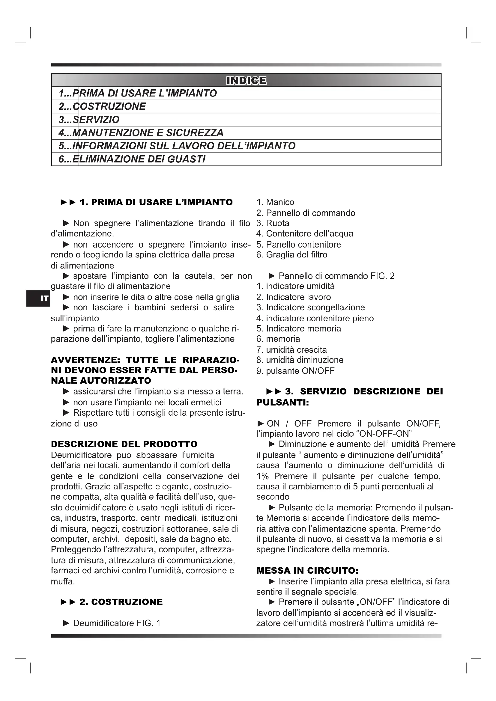 PULSANTI: ► ON / OFF Premere il pulsante ON/OFF, l’impianto lavoro nel ciclo “ON-OFF-ON” ► Diminuzione e aumento dell’ umidità Premere il pulsante “ aumento e diminuzione dell’umidità” causa l’aumento o diminuzione dell’umidità di 1% Premere il pulsante per qualche tempo, causa il cambiamento di 5 punti percentuali al secondo ► Pulsante della memoria: Premendo il pulsan- te Memoria si accende l’indicatore della memo- ria attiva con l’alimentazione spenta. Premendo il pulsante di nuovo, si desattiva la memoria e si spegne l’indicatore della memoria. MESSA IN CIRCUITO: ► Inserire l’impianto alla presa elettrica, si fara sentire il segnale speciale. ► Premere il pulsante „ON/OFF” l’indicatore di lavoro dell’impianto si accenderà ed il visualiz- zatore dell’umidità mostrerà l’ultima umidità re- INDICE