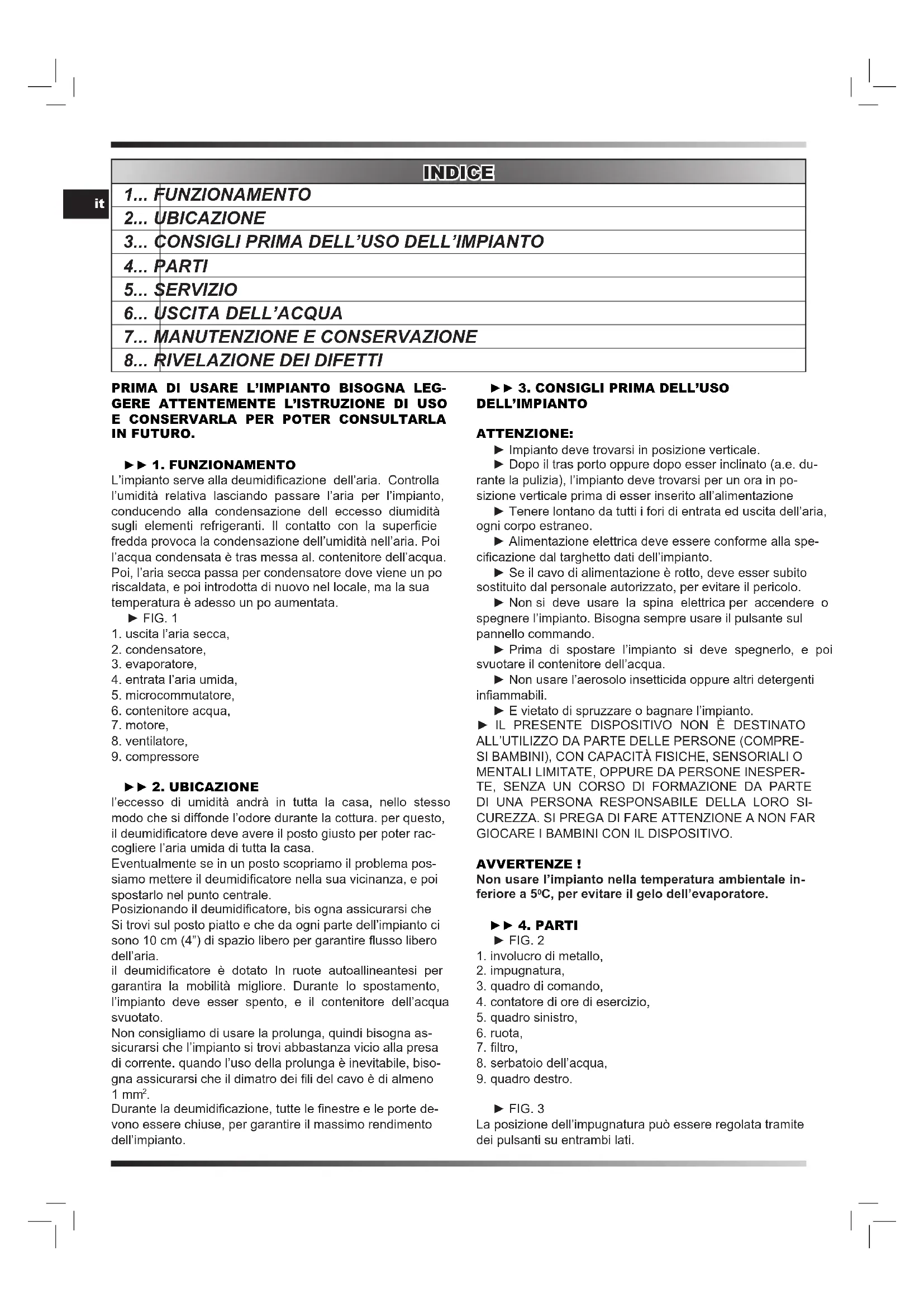 IN FUTURO. ► 1. FUNZIONAMENTO L’impianto serve alla deumidicazione dell’aria. Controlla l’umidità relativa lasciando passare l’aria per l’impianto, conducendo alla condensazione dell eccesso diumidità sugli elementi refrigeranti. Il contatto con la supercie fredda provoca la condensazione dell’umidità nell’aria. Poi l’acqua condensata è tras messa al. contenitore dell’acqua. Poi, l’aria secca passa per condensatore dove viene un po riscaldata, e poi introdotta di nuovo nel locale, ma la sua temperatura è adesso un po aumentata. ► FIG. 1