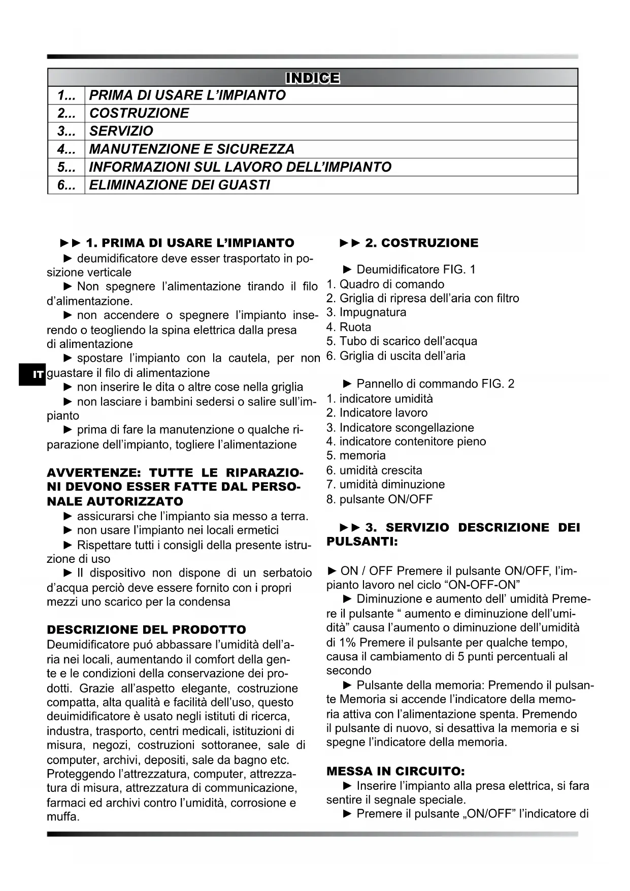 PULSANTI: ► ON / OFF Premere il pulsante ON/OFF, l’im- pianto lavoro nel ciclo “ON-OFF-ON” ► Diminuzione e aumento dell’ umidità Preme- re il pulsante “ aumento e diminuzione dell’umi- dità” causa l’aumento o diminuzione dell’umidità di 1% Premere il pulsante per qualche tempo, causa il cambiamento di 5 punti percentuali al secondo ► Pulsante della memoria: Premendo il pulsan- te Memoria si accende l’indicatore della memo- ria attiva con l’alimentazione spenta. Premendo il pulsante di nuovo, si desattiva la memoria e si spegne l’indicatore della memoria. MESSA IN CIRCUITO: ► Inserire l’impianto alla presa elettrica, si fara sentire il segnale speciale. ► Premere il pulsante „ON/OFF” l’indicatore di INDICE