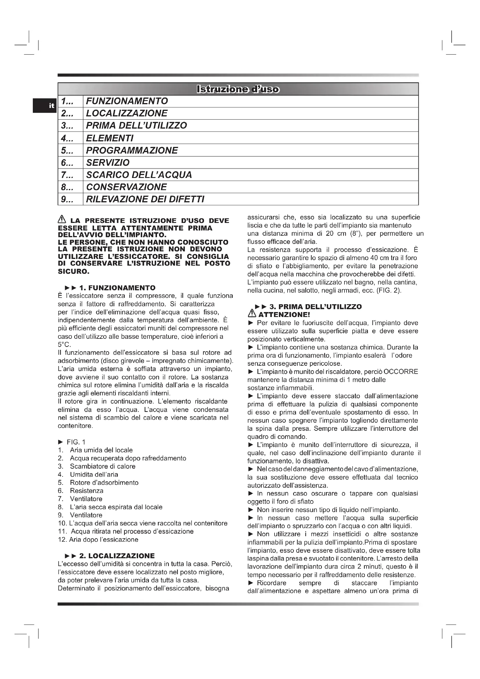 ATTENZIONE! ► Per evitare le fuoriuscite dell’acqua, l’impianto deve essere utilizzato sulla supercie piatta e deve essere posizionato verticalmente. ► L’impianto contiene una sostanza chimica. Durante la prima ora di funzionamento, l’impianto esalerà l’odore senza conseguenze pericolose. ► L’impianto è munito del riscaldatore, perciò OCCORRE mantenere la distanza minima di 1 metro dalle sostanze inammabili. ► L’impianto deve essere staccato dall’alimentazione prima di effettuare la pulizia di qualsiasi componente di esso e prima dell’eventuale spostamento di esso. In nessun caso spegnere l’impianto togliendo direttamente la spina dalla presa. Sempre utilizzare l’interruttore del quadro di comando. ► L’impianto è munito dell’interruttore di sicurezza, il quale, nel caso dell’inclinazione dell’impianto durante il funzionamento, lo disattiva. ► Nel caso del danneggiamento del cavo d’alimentazione, la sua sostituzione deve essere effettuata dal tecnico autorizzato dell’assistenza. ► In nessun caso oscurare o tappare con qualsiasi oggetto il foro di sato ► Non inserire nessun tipo di liquido nell’impianto. ► In nessun caso mettere l’acqua sulla supercie dell’impianto o spruzzarlo con l’acqua o con altri liquidi. ► Non utilizzare i mezzi insetticidi o altre sostanze inammabili per la pulizia dell’impianto.Prima di spostare l’impianto, esso deve essere disattivato, deve essere tolta laspina dalla presa e svuotato il contenitore. L’arresto della lavorazione dell’impianto dura circa 2 minuti, questo è il tempo necessario per il raffreddamento delle resistenze. ► Ricordare sempre di staccare l’impianto dall’alimentazione e aspettare almeno un’ora prima di Istruzione d’uso 1... FUNZIONAMENTO 2... LOCALIZZAZIONE