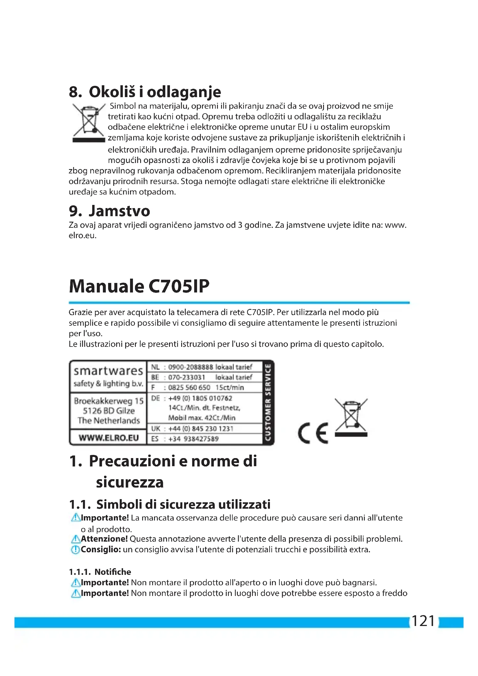 Za ovaj aparat vrijedi ograničeno jamstvo od 3 godine. Za jamstvene uvjete idite na: www. elro.eu. Manuale C705IP Grazie per aver acquistato la telecamera di rete C705IP. Per utilizzarla nel modo più semplice e rapido possibile vi consigliamo di seguire attentamente le presenti istruzioni per l'uso. Le illustrazioni per le presenti istruzioni per l'uso si trovano prima di questo capitolo.