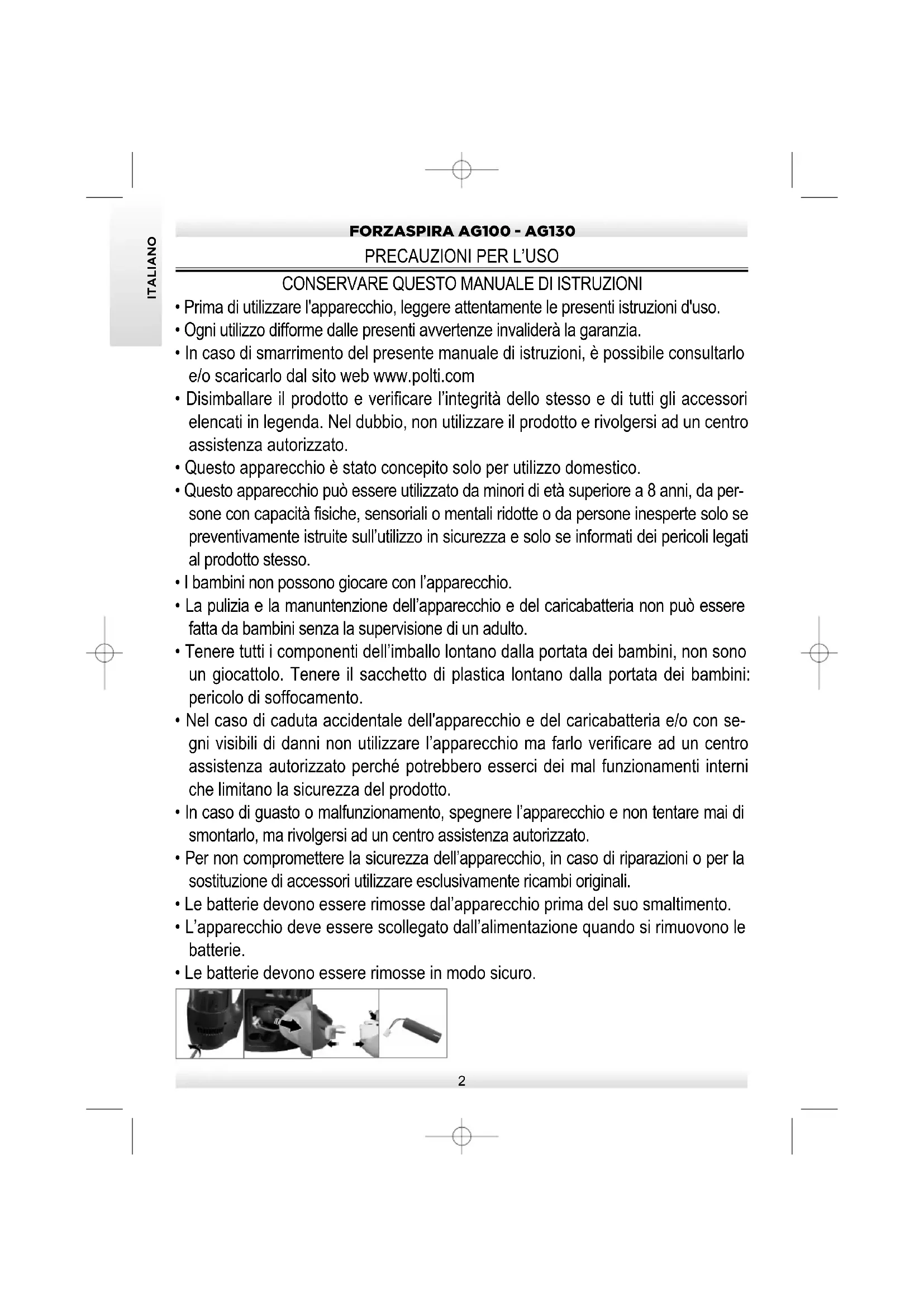 ITALIANO AVVERTENZE DI SICUREZZA : Rischio di scariche elettriche e/o corto circuito: - Il caricabatteria serve per caricare le batterie poste all’interno dell’apparecchio. Non utilizzare l’apparecchio con il caricabatteria collegato. - L’impianto elettrico a cui è collegato il caricabatteria dovrà essere realizzato in conformità alle leggi vigenti. - Prima di collegare il caricabatteria accertarsi che la tensione di rete corrisponda a quella indicata sui dati di targa. - Se il caricabatteria dovesse restare inutilizzato, staccare la spina di alimenta- zione dalla rete elettrica. - Prima di effettuare qualunque operazione di manutenzione, spegnere sempre l'apparecchio. . - Non staccare il cavo di alimentazione del caricabatteria tirandolo, ma estrarre la spina per evitare danni alla presa. - Non permettere che il cavo di alimentazione del caricabatteria subisca torsioni, schiacciature o stiramenti o entri in contatto con superfici affilate o riscaldate. - Non utilizzare il caricabatteria se il cavo alimentazione o altre parti importanti del- l'apparecchio sono danneggiate ma rivolgersi ad un centro assistenza autoriz- zato. - Se il caricabatteria con rispettivo cavo fosse visibilmente danneggiato, sostituirlo immediatamente con un pezzo di ricambio originale Polti. Non cercare in alcun modo di ripararlo. - Non utilizzare prolunghe elettriche non autorizzate dal fabbricante, che potreb- bero causare danni ed incendi. - Non toccare mai il caricabatteria con mani o piedi bagnati in particolare quando la spina è inserita. - Non usare il caricabatteria a piedi nudi. - Non utilizzare il caricabatteria nelle immediate vicinanze di lavandini, vasche da bagno, docce o recipienti pieni d'acqua. - Non immergere mai l'apparecchio, il cavo o le spine nell'acqua o in altri liquidi.FORZASPIRA AG100 - AG130