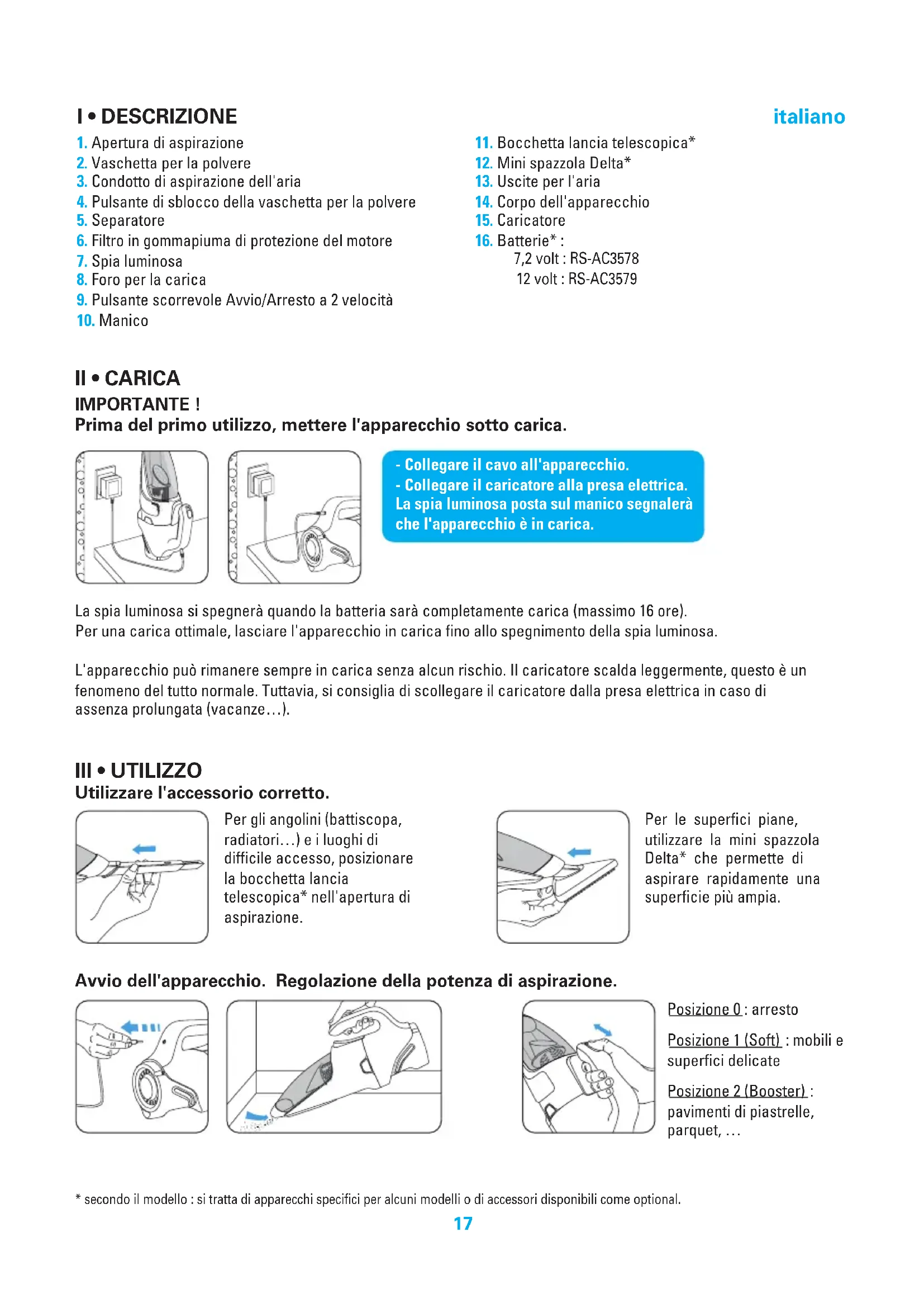 - secondo il modello : si tratta di apparecchi specifici per alcuni modelli o di accessori disponibili come optional. Per le superfici piane, utilizzare la mini spazzola Delta* che permette di aspirare rapidamente una superficie più ampia. - Collegare il cavo all'apparecchio. - Collegare il caricatore alla presa elettrica. La spia luminosa posta sul manico segnalerà che l'apparecchio è in carica. I • DESCRIZIONE