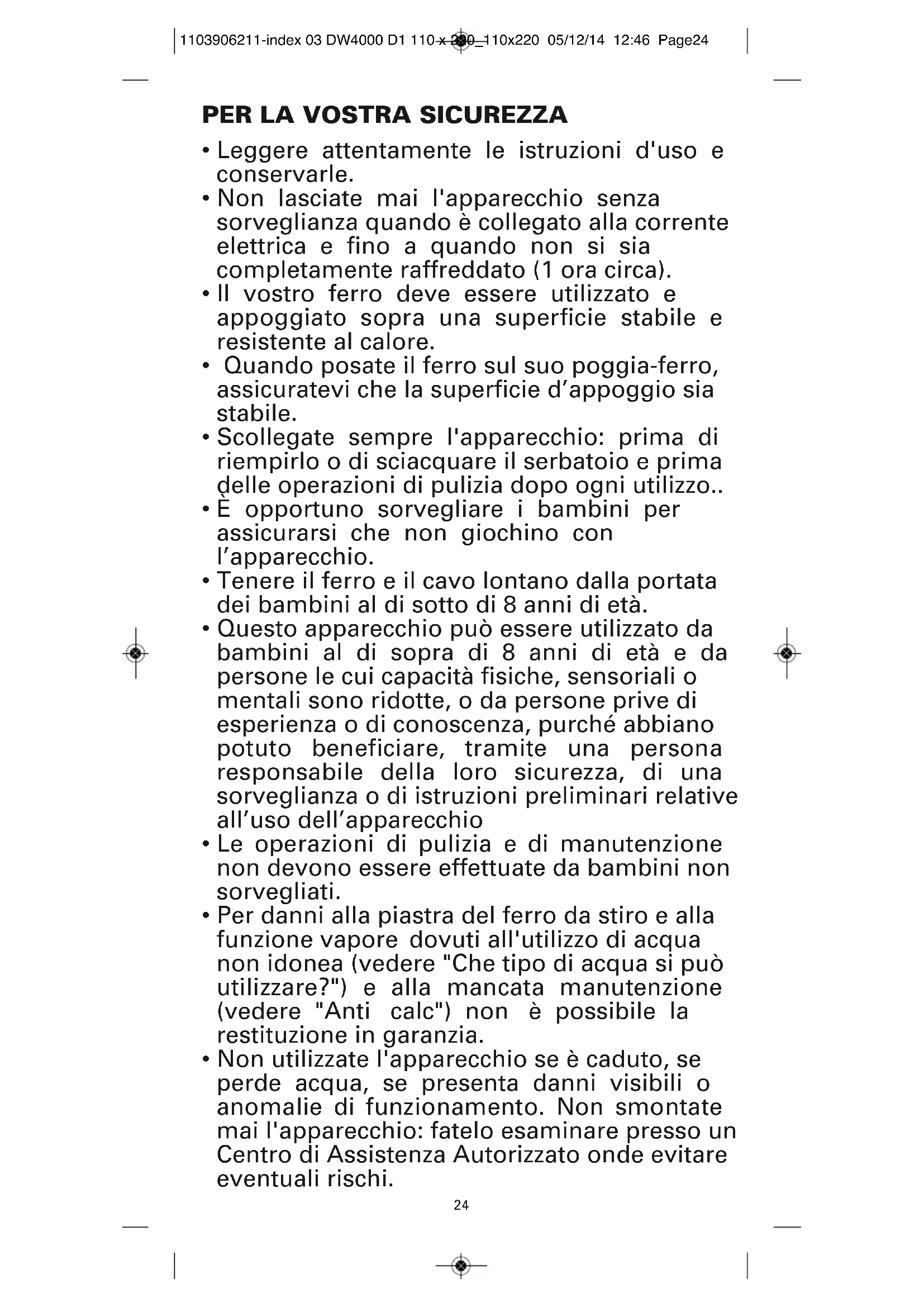 - Non utilizzate l'apparecchio se è caduto, se perde acqua, se presenta danni visibili o anomalie di funzionamento. Non smontate mai l'apparecchio: fatelo esaminare presso un Centro di Assistenza Autorizzato onde evitare eventuali rischi. 1103906211-index 03 DW4000 D1 110 x 220_110x220 05/12/14 12:46 Page2425